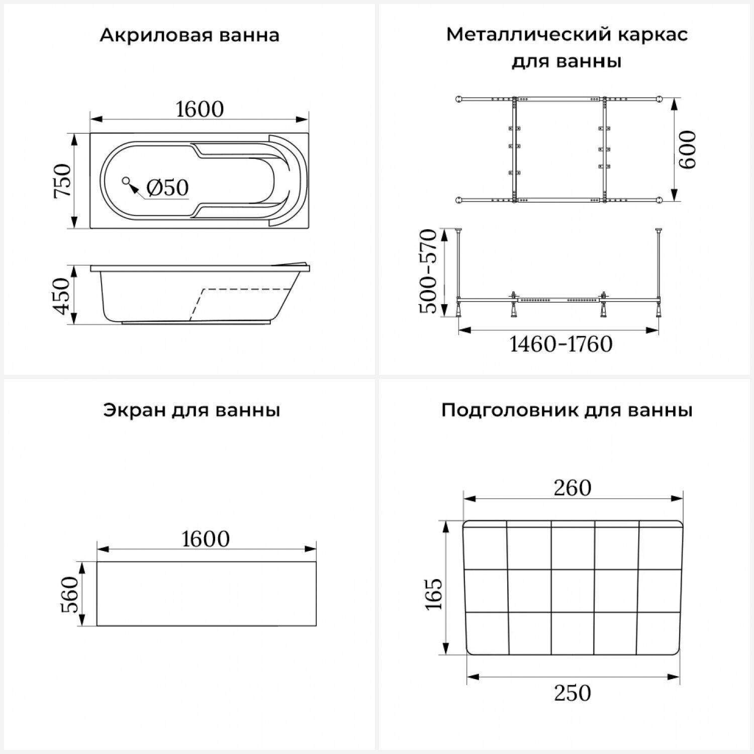 Акриловая ванна 160х75 см Lavinia Boho Bristol набор 4 в 1: прямоугольная ванна, металлический каркас, подголовник, лицевой экран