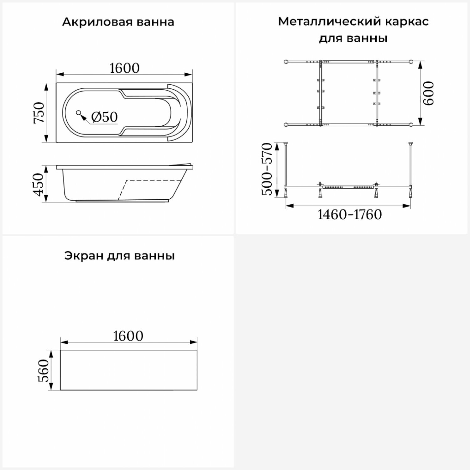 Акриловая ванна 160х75 см Lavinia Boho Bristol набор 3 в 1 S2-35020060: прямоугольная ванна, металлический каркас, лицевой экран