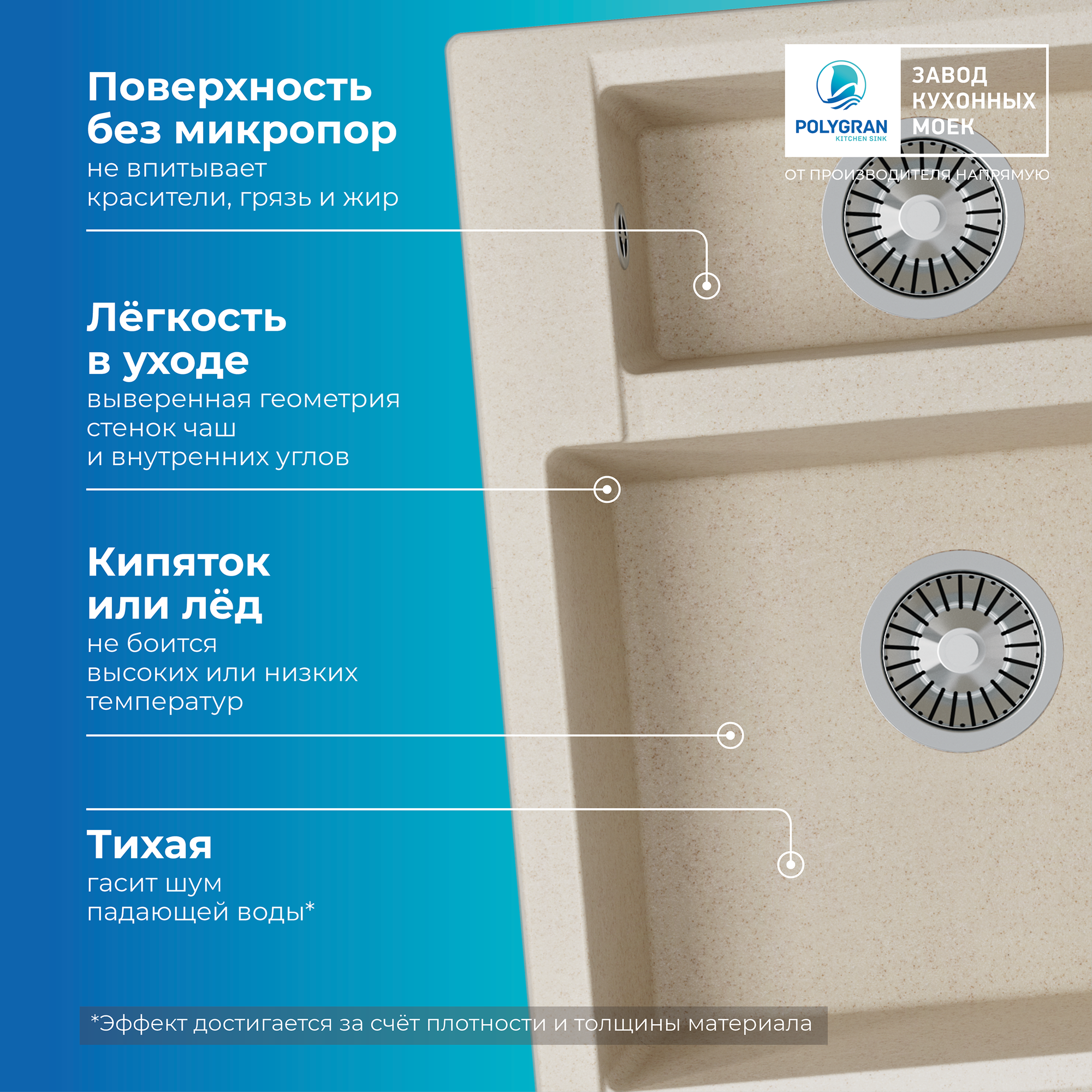 СохранитьМойка для кухни POLYGRAN Brig-620 врезная, каменная, с дополнительной чашей (№327 Кремовый) интересное: