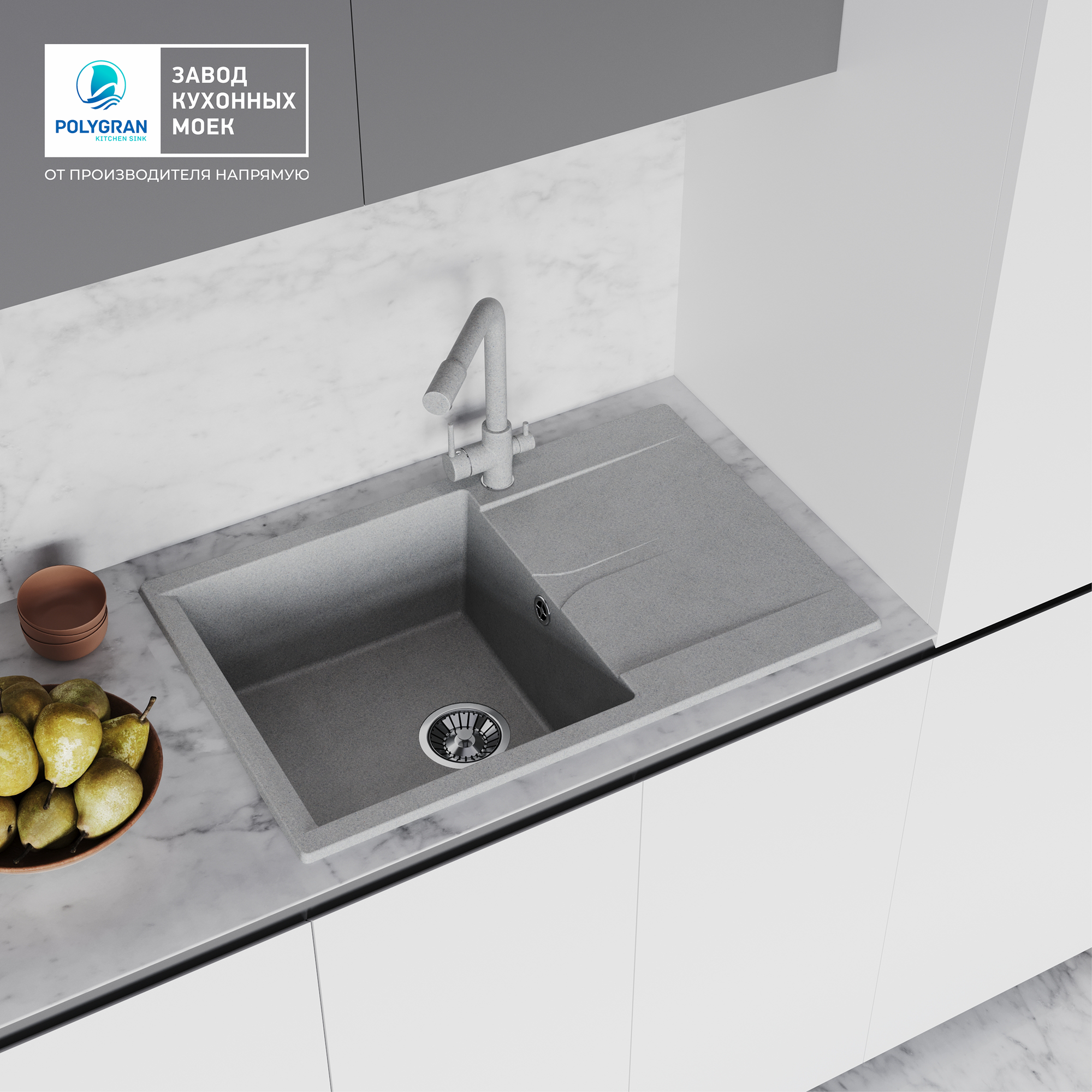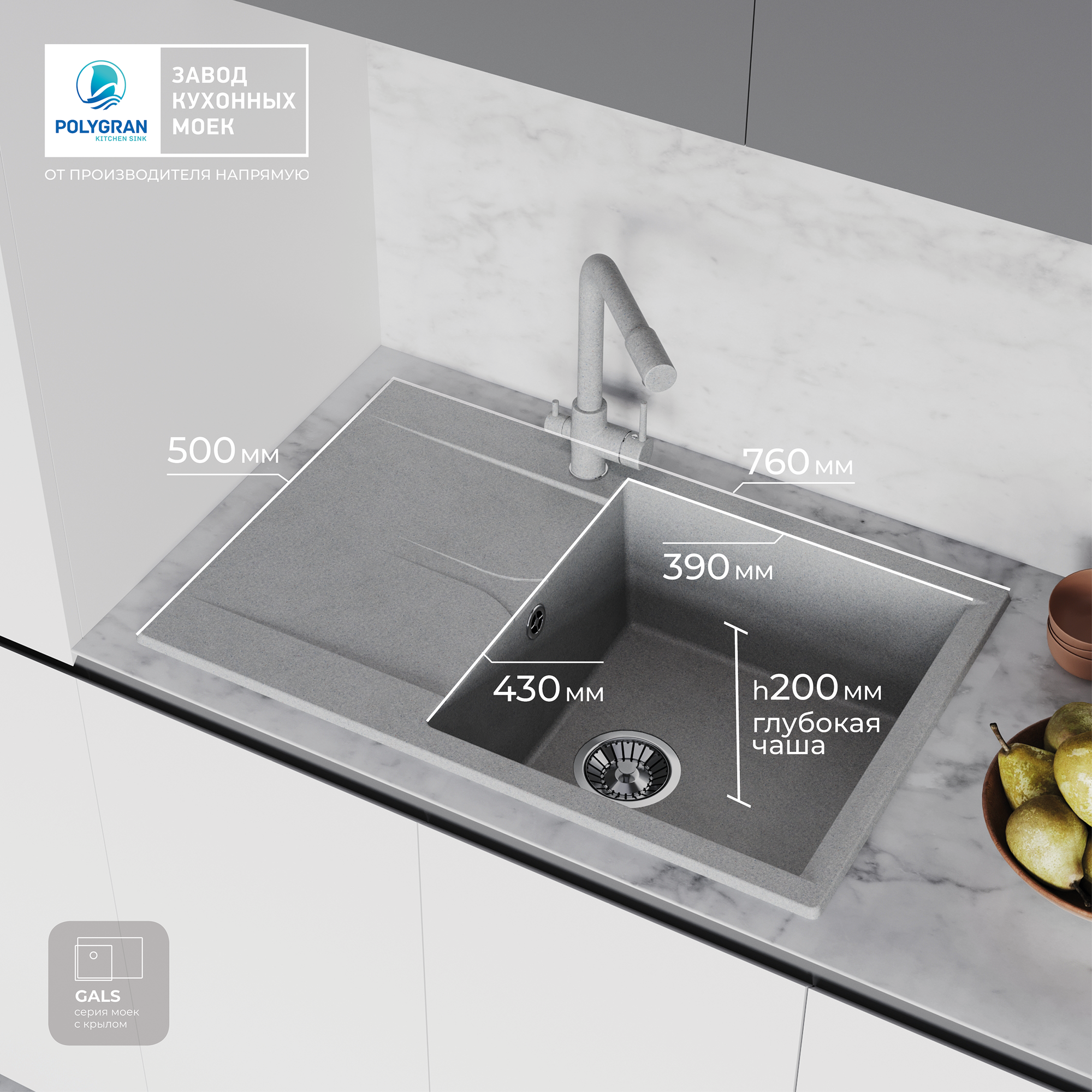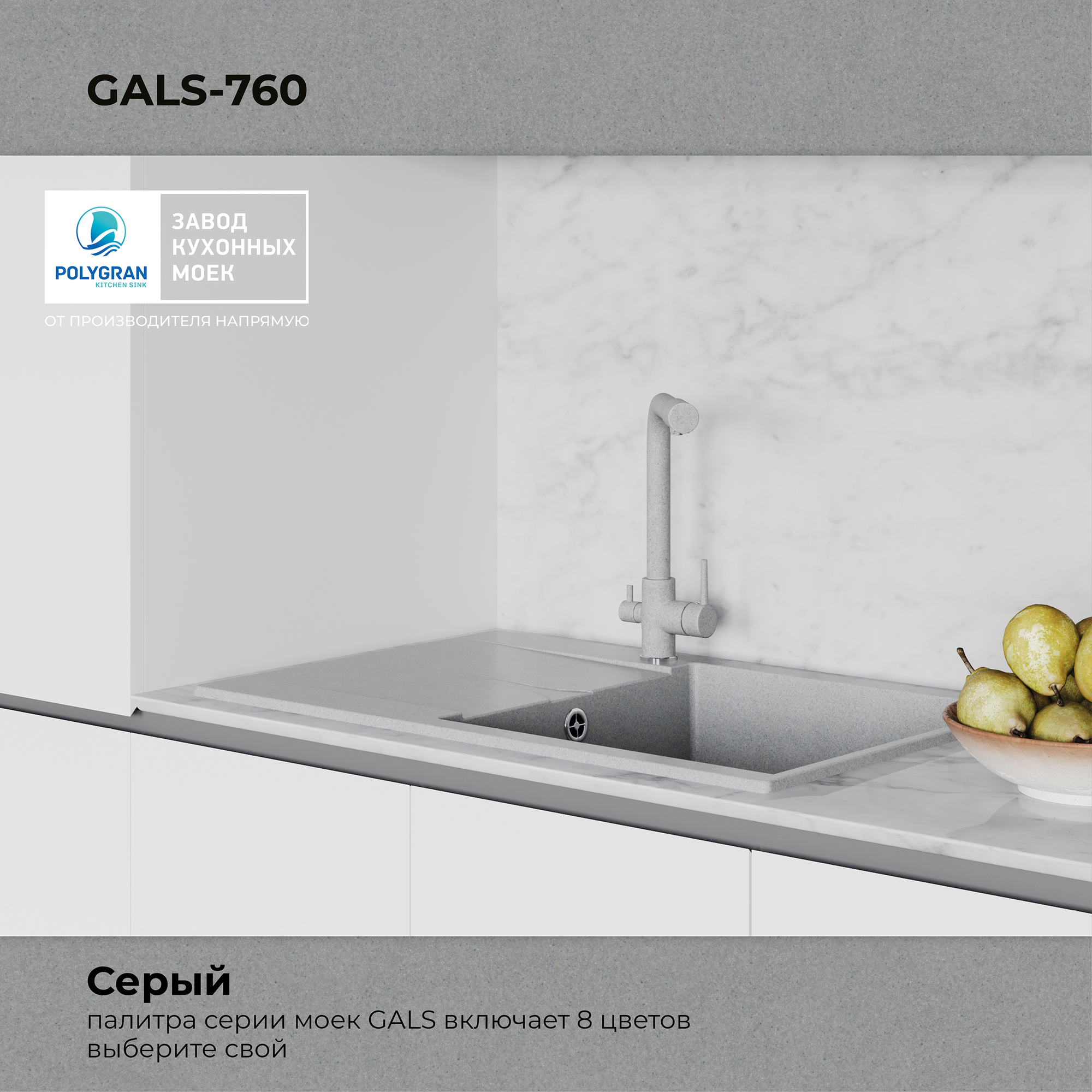 СохранитьМойка для кухни POLYGRAN Gals-760 каменная, врезная, раковина кухонная с крылом (№14 Серый) интересное: