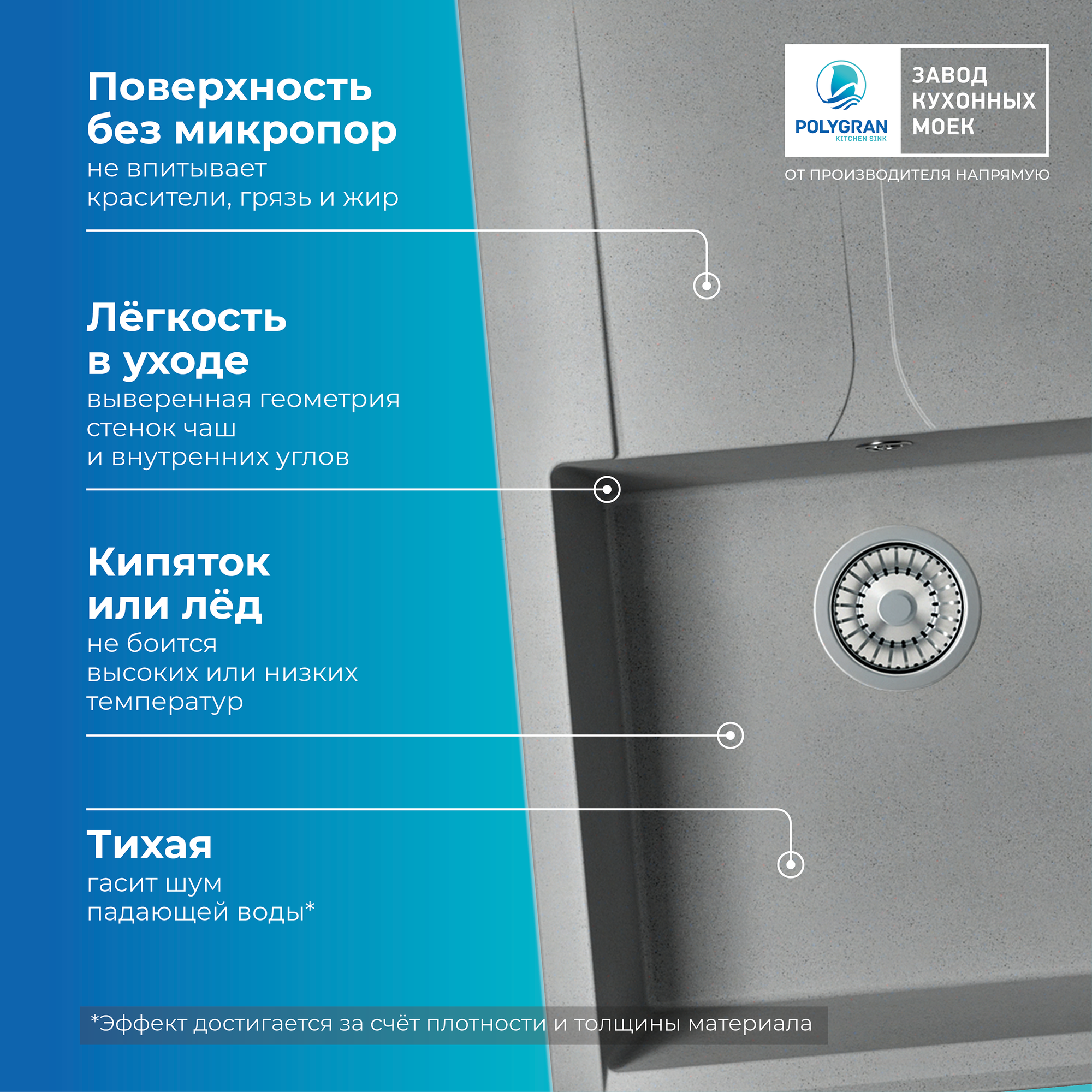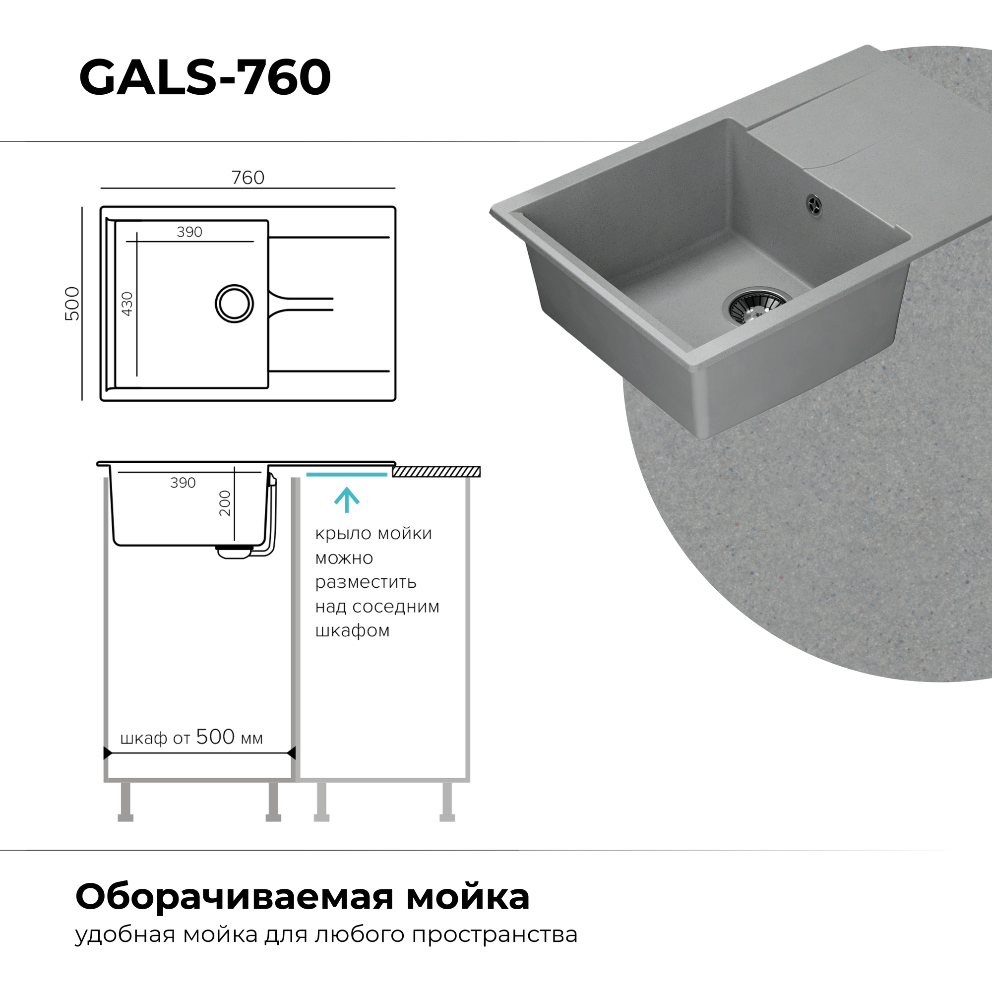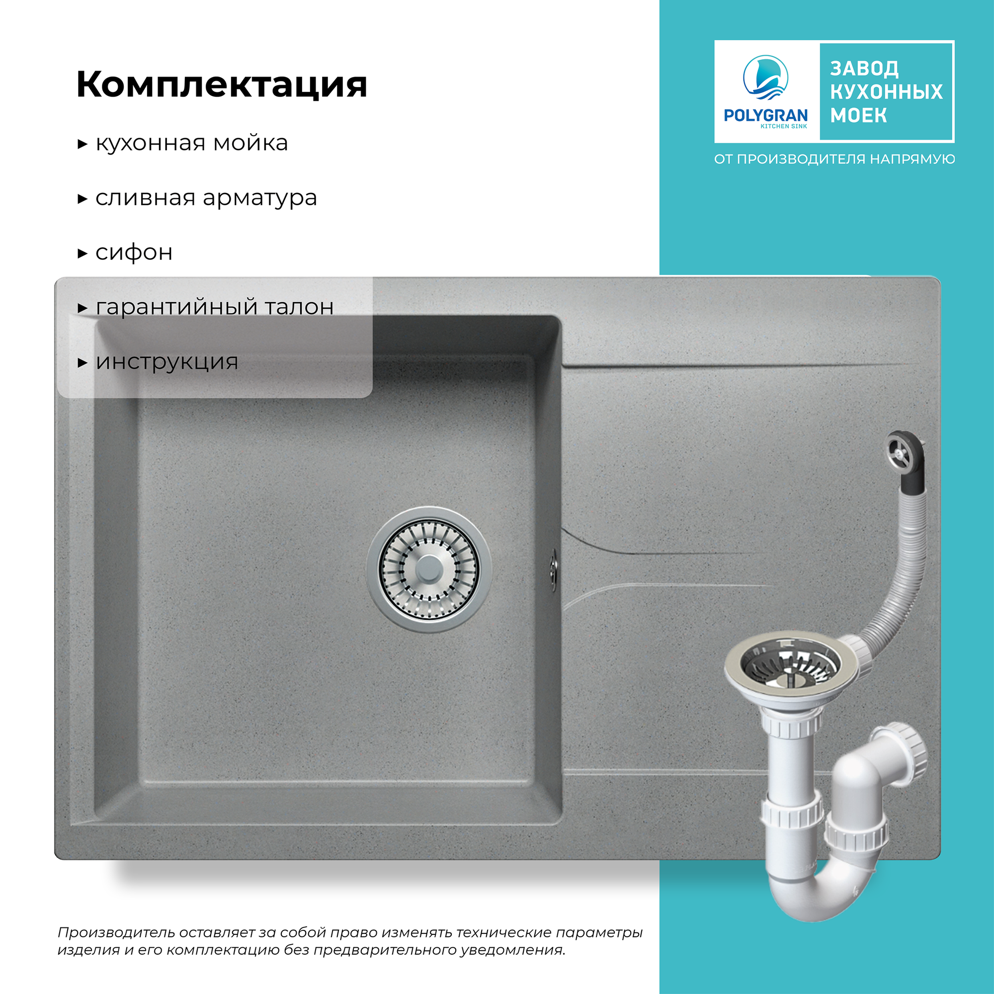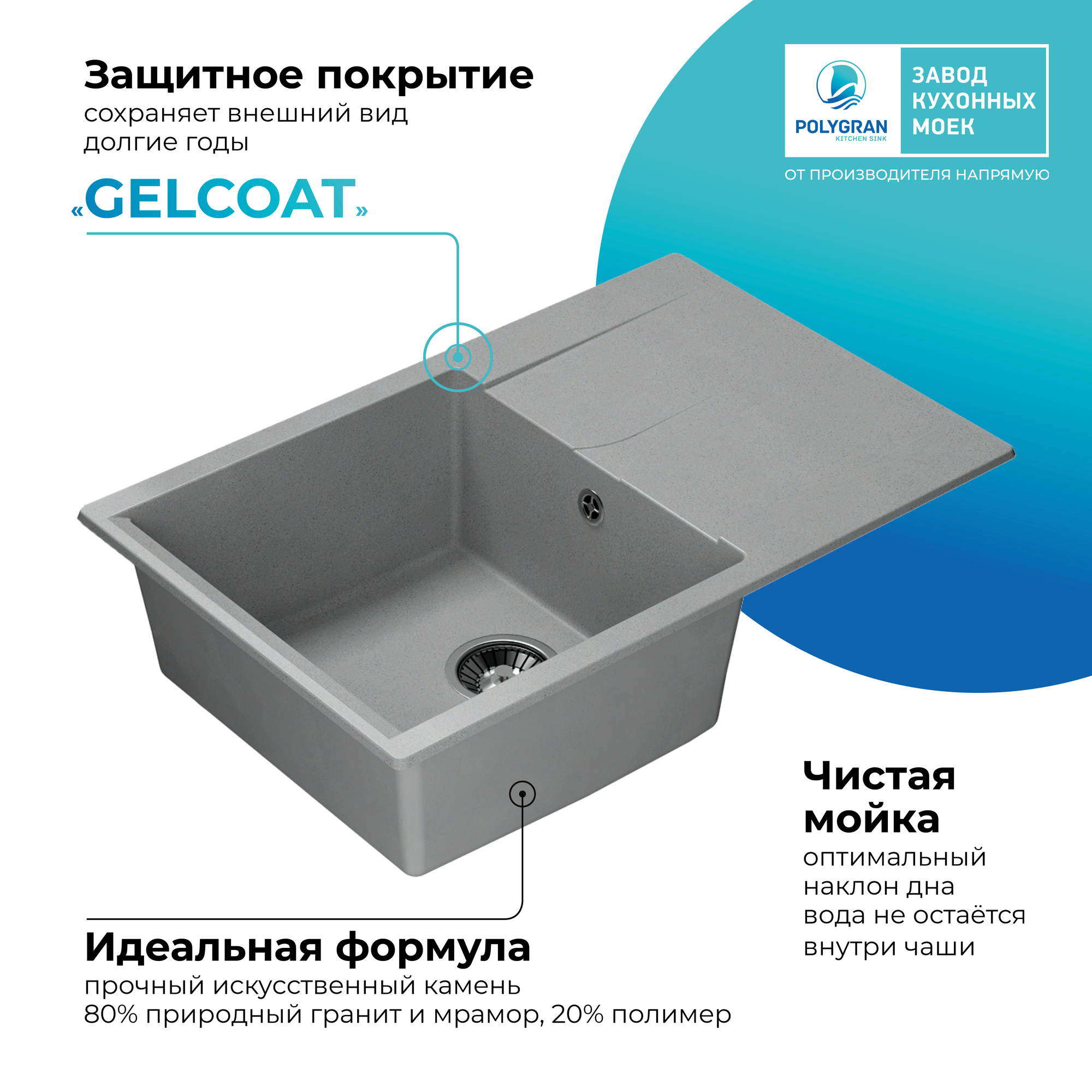 СохранитьМойка для кухни POLYGRAN Gals-760 каменная, врезная, раковина кухонная с крылом (№14 Серый) интересное: