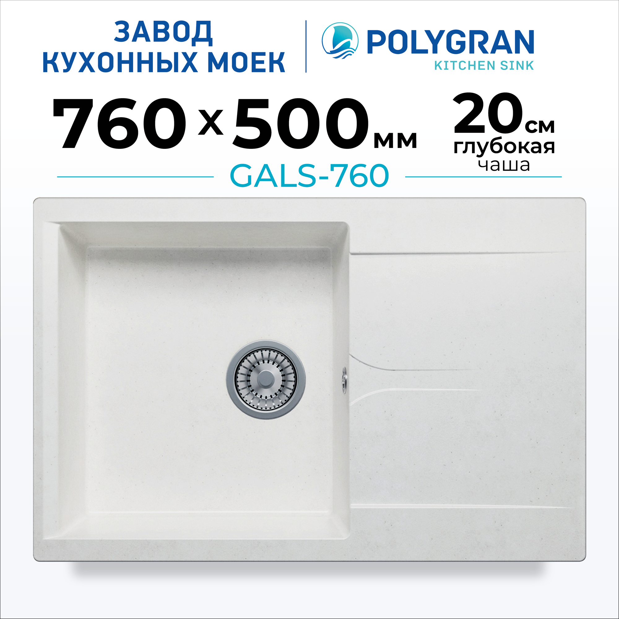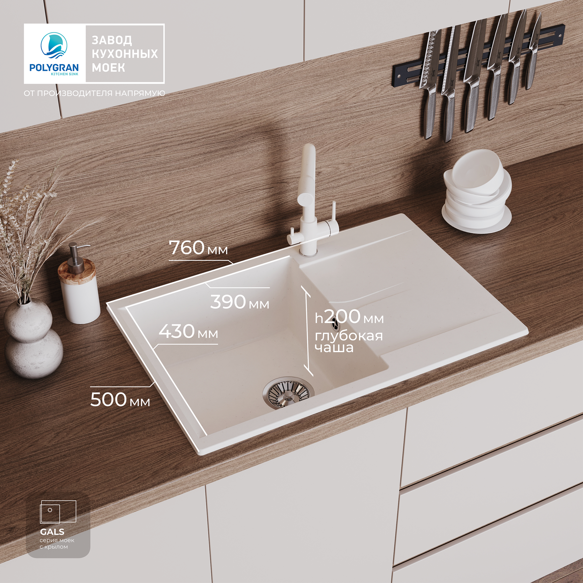 Мойка для кухни POLYGRAN Gals-760 каменная, врезная, раковина кухонная с крылом (№36 Белый Хлопок)