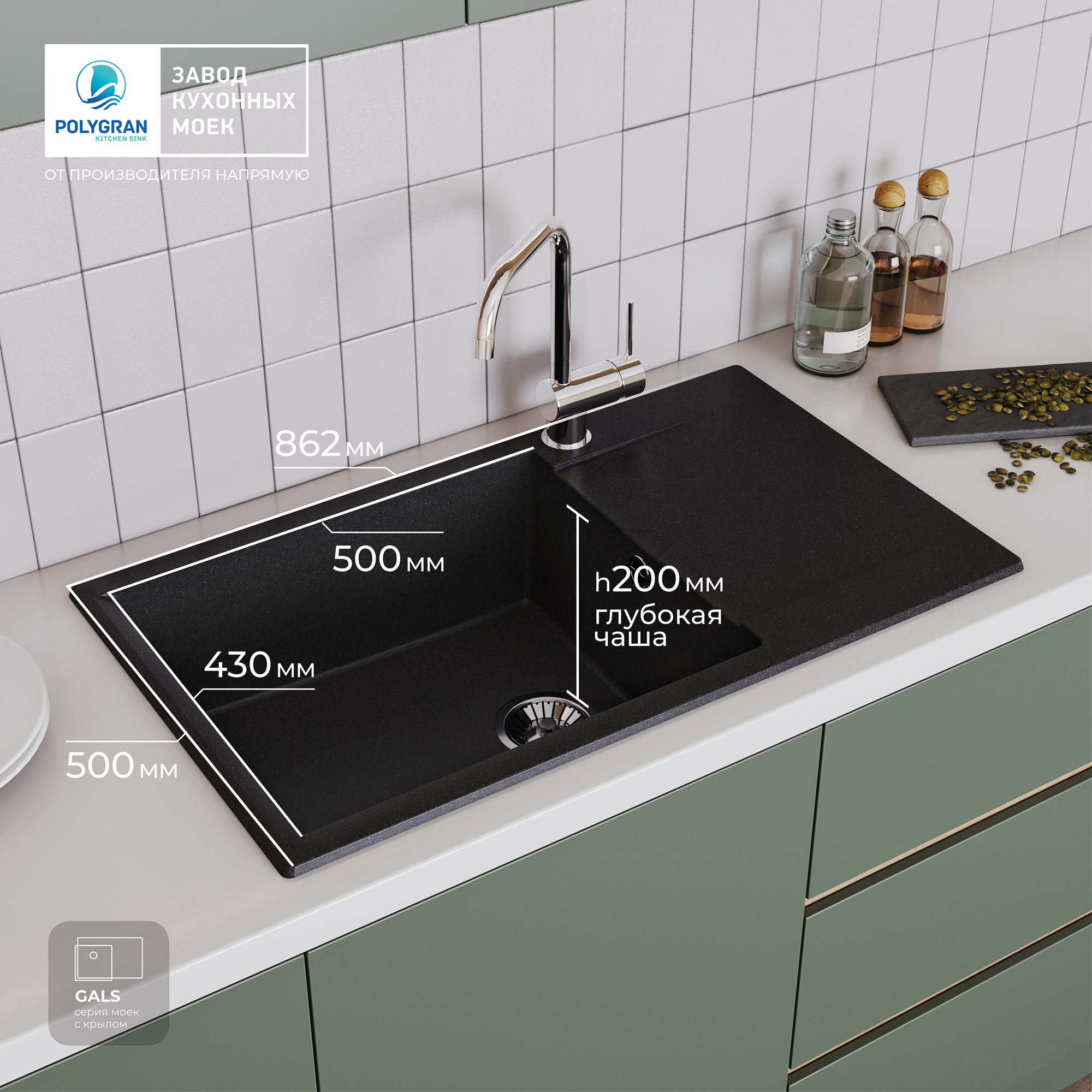 СохранитьМойка для кухни POLYGRAN Gals-862 каменная с удлиненным крылом (№16 Черный) интересное: