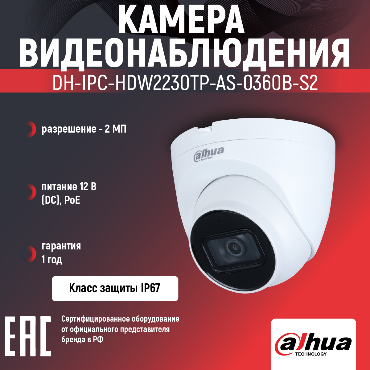 DAHUA Видеонаблюдение DH-IPC-HDW2230TP-AS-0360B-S2 Уличная турельная IP-видеокамера 2Мп, 1 2.7” CMOS, объектив 3.6мм, видеоаналитика, ИК-подсветка до 30м, IP67, корпус: металл, пластик