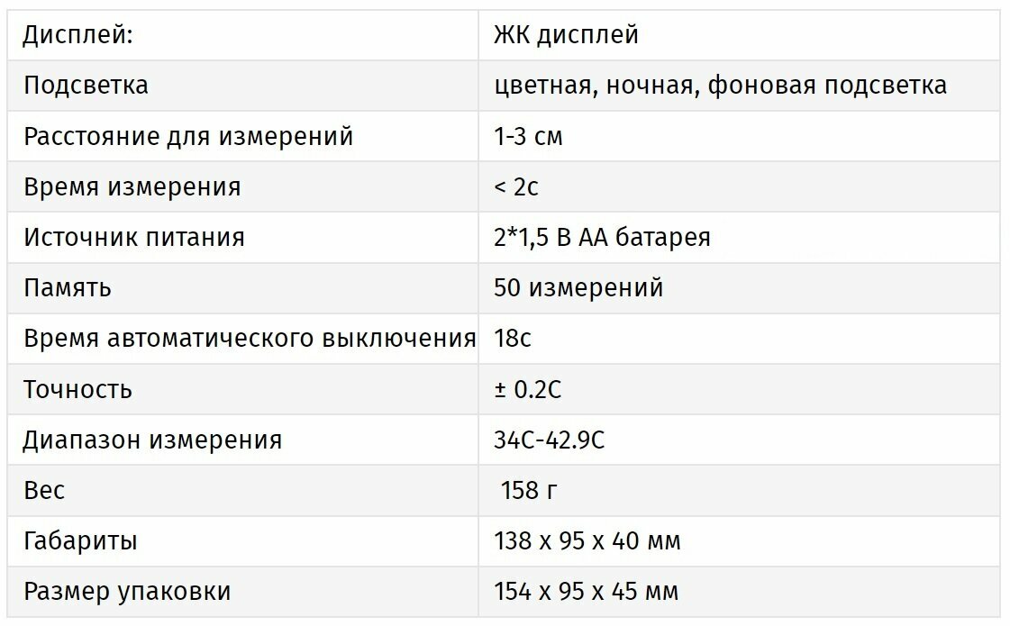 | Минусы: | Как по мне большая погрешность. На одном и том же месте, если сделать замеров 5-6, показывает с разницей до 0,5 градуса, например, от 37,0 до 37,5. |