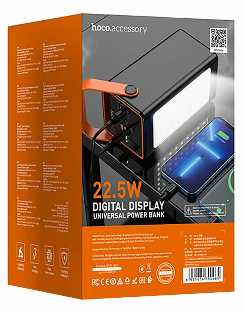 Универсальный Доп. Аккумулятор 30000mAh, J108B, HOCO, выход: 1 USB (22.5W)+1 PD (18W), черный