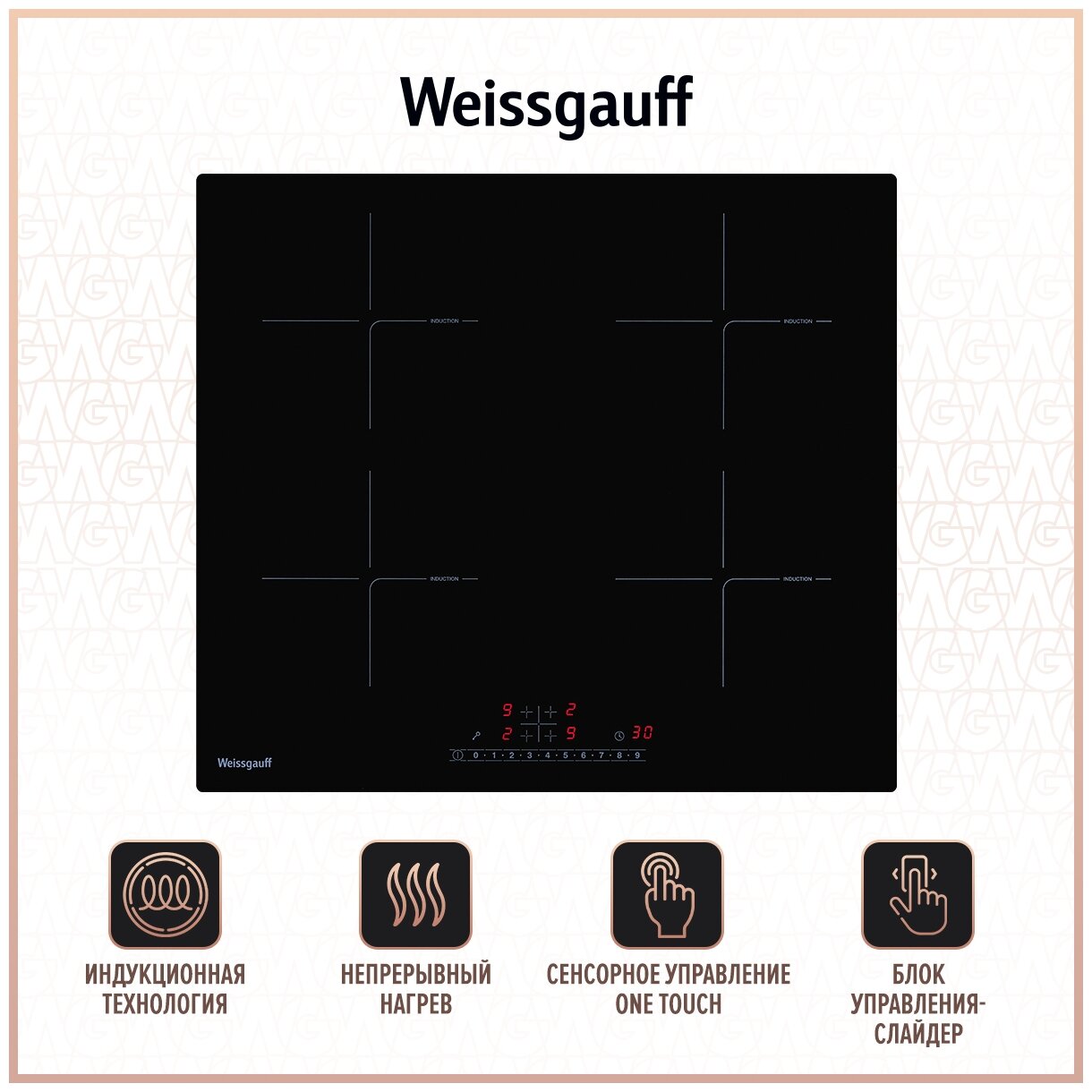 Индукционная варочная панель с инвертором и слайдером Weissgauff HI 640 GSC,3 года гарантии, дизайн конфорок Glide Zone, 58 см ширина