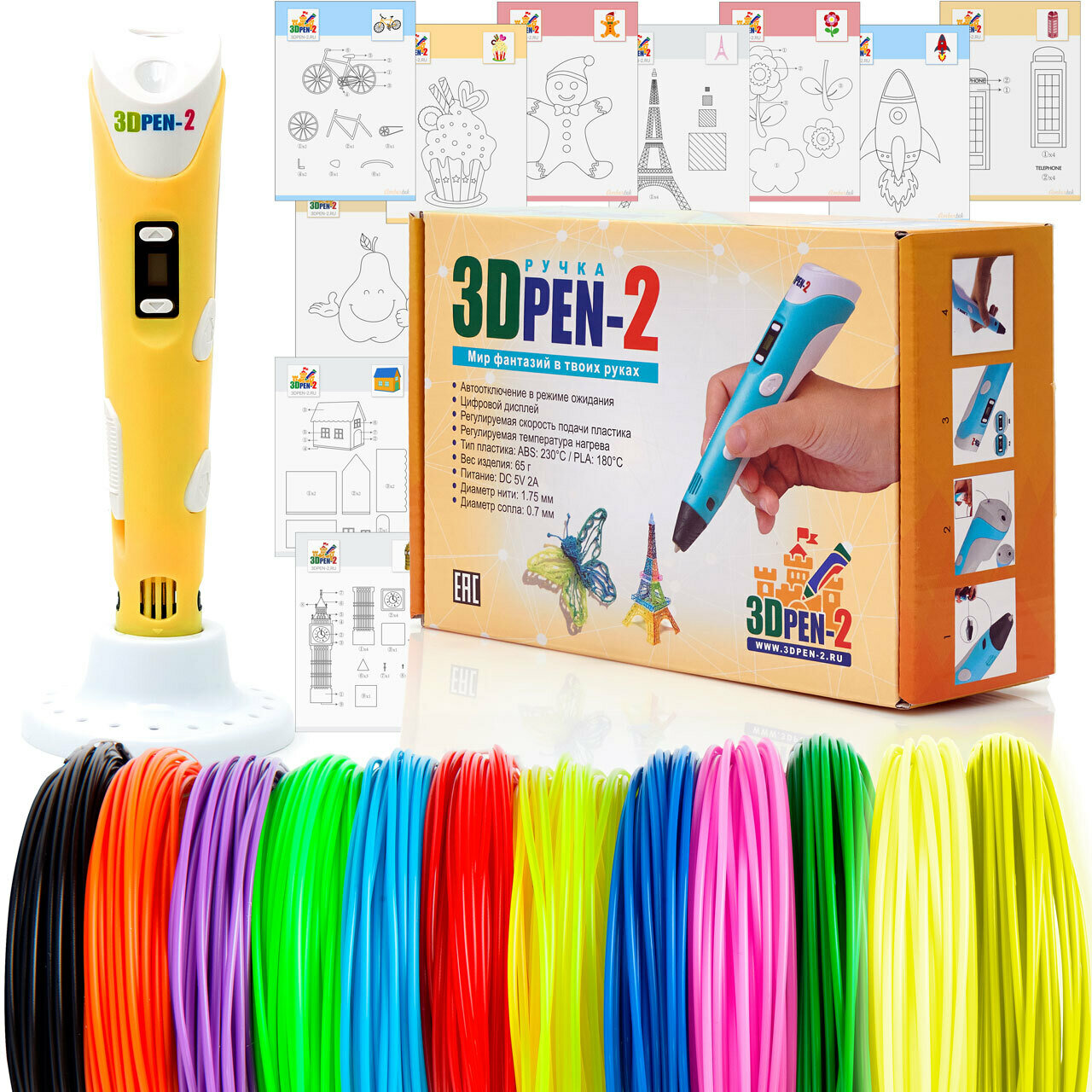 Купить 3D ручка 3DPEN-2 (цвет: желтый) с набором пластика PLA 12 цветов по 10 метров и набором трафаретов