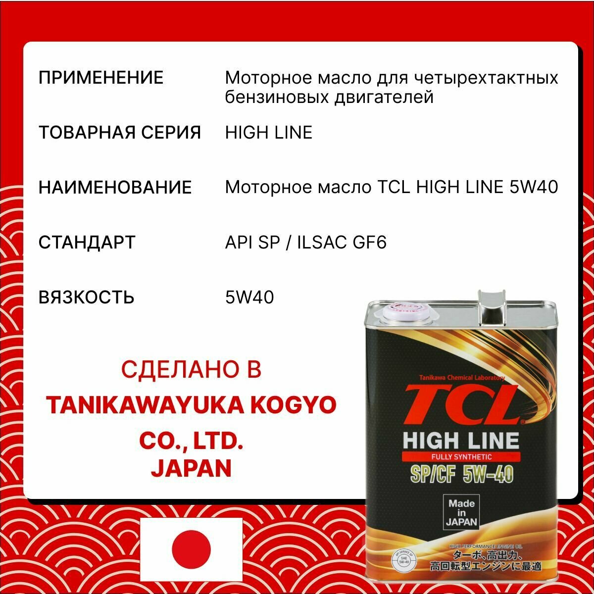 Синтетическое моторное масло для двигателя TCL High Line, Fully Synth, SP/CF, 5W40, 4 литра, арт. H0040540SP