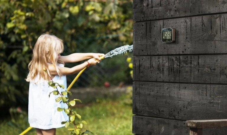 | Плюсы: | Симпатичный, компактный, постоянно включённый дисплей и при этом долгая жизнь от батарейки, можно повесить на стену, интегрируется с homekit |