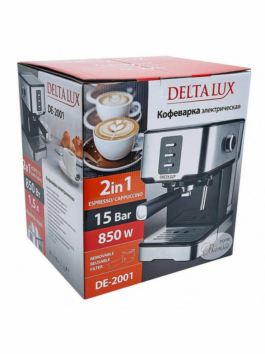 Кофеварка рожковая 850 Вт, 1,5 л, 15 бар DELTA LUX DE-2001 черная