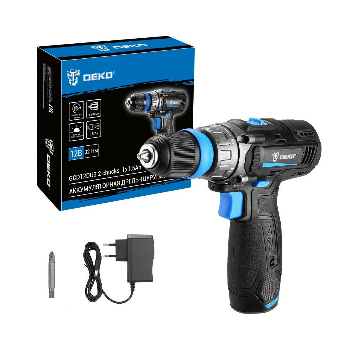 Аккумуляторная дрель-шуруповерт DEKO GCD12DU3 Li-Ion со съемным патроном, 32 Нм, 1х1.5 Ач, з/у