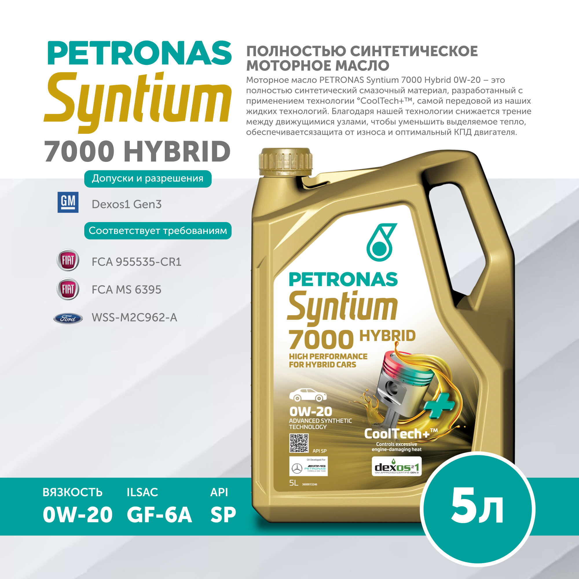 Купить Моторное масло PETRONAS SYNTIUM 7000 HYBRID 0W-20 Синтетическое 5л API SP, ILSAC GF-6A, Dexos1 Gen2, FCA 955535-CR1, FCA MS 6395, 70803M12EU