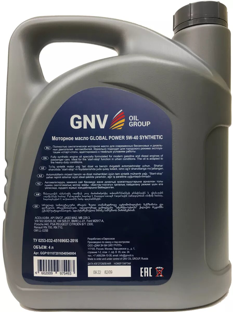 Моторное Масло Gnv Global Power 5w-40 Synthetic A3/B4. Sn/Cf (Канистра 4 Л.) GNV арт. GGP1011072016540540004