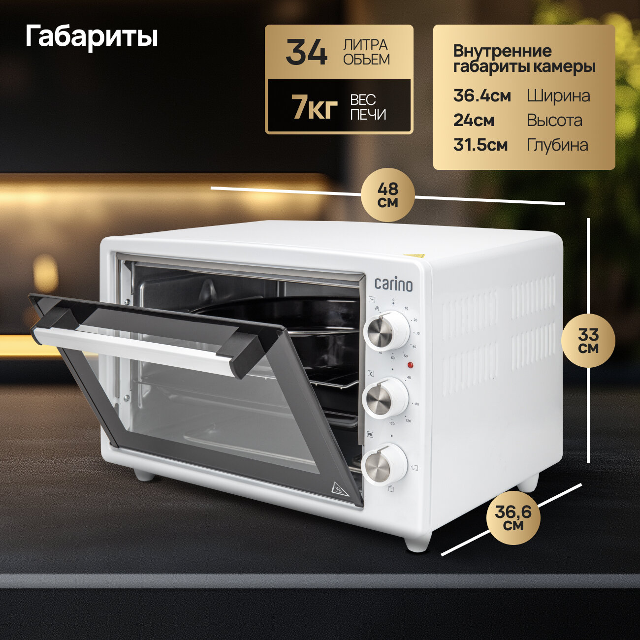 Мини-печь CARINO M3426, 3 режима, 34л, 1300Вт, таймер
