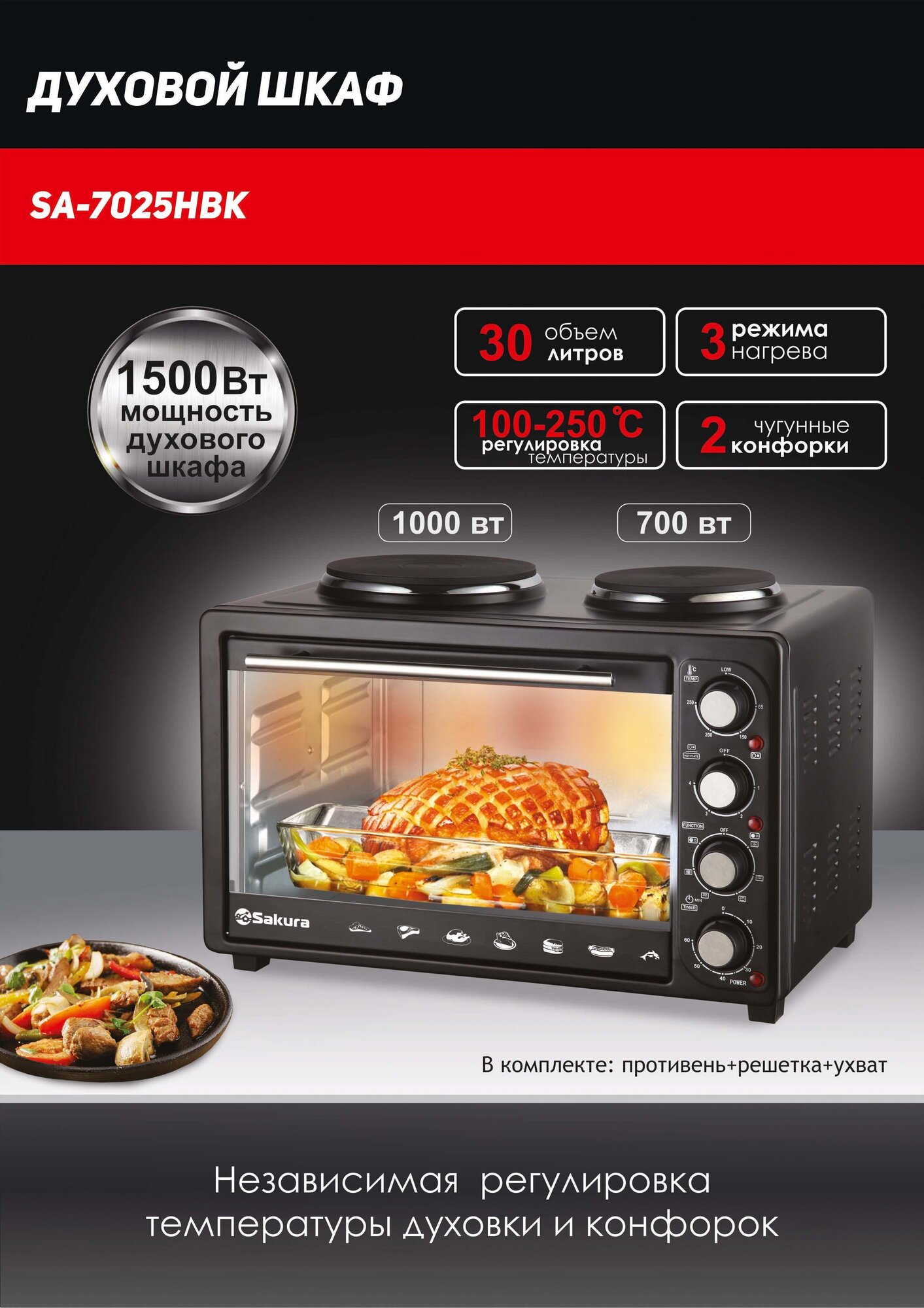 Духовка электрическая Sakura SA-7025HBK 3200Вт 30л 2конфорки чугунные, чёрный