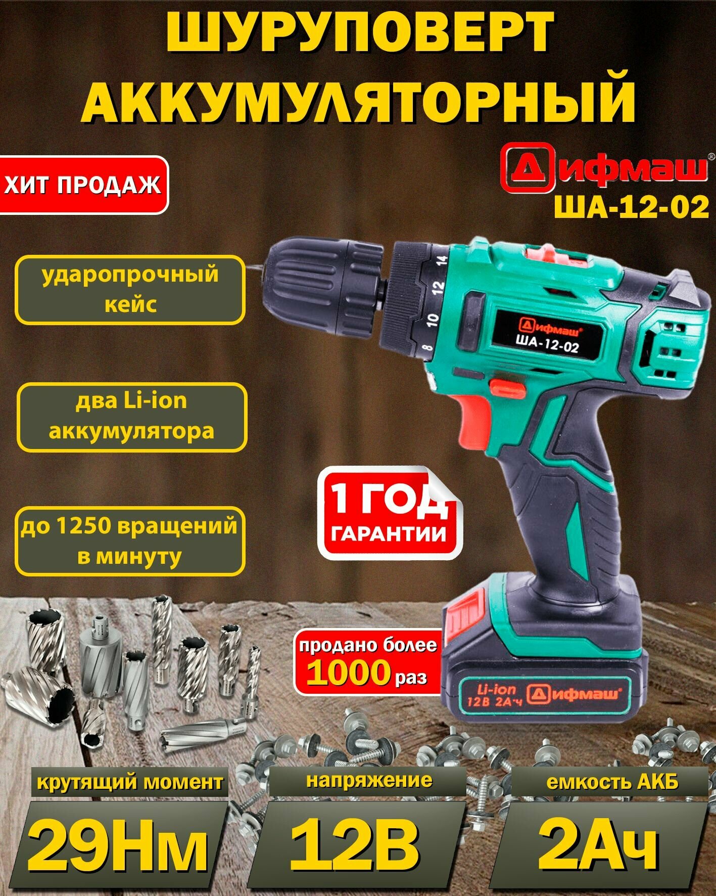 Шуруповерт аккумуляторный дифмаш ША-12-02 (дрель-шуруповерт), 12 В, 29 Нм, 2 Li-ion АКБ, реверс, ЗУ, кейс