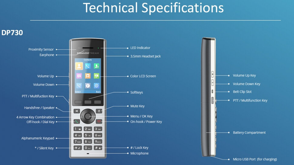 IP-телефон Grandstream DP730 DECT, 10 SIP аккаунтов, 2,4 цветной дисплей 240x320, конференция на 3 абонента, 3,5 jack.