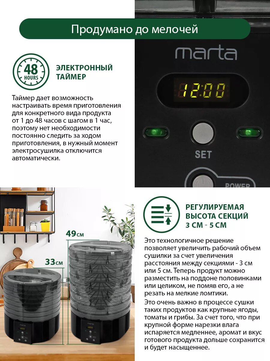 | Отзыв: | Приобрели сушилку MARTA MT-1883, готовясь к новому дачному сезону. Урожай яблок обычно у нас очень большой, купили в первую очередь для этого. Но и для других фруктов пригодится. Сама сушилка компактная, вместительная, пластик вроде хорошего качества. Температура сушки - 40-70 градусов. Есть 11 поддонов. Сетевой шнур немного длиннее метра, но нам этого хватает. Работает практически бесшумно, так что будем ее ставить на сушку на ночь. |