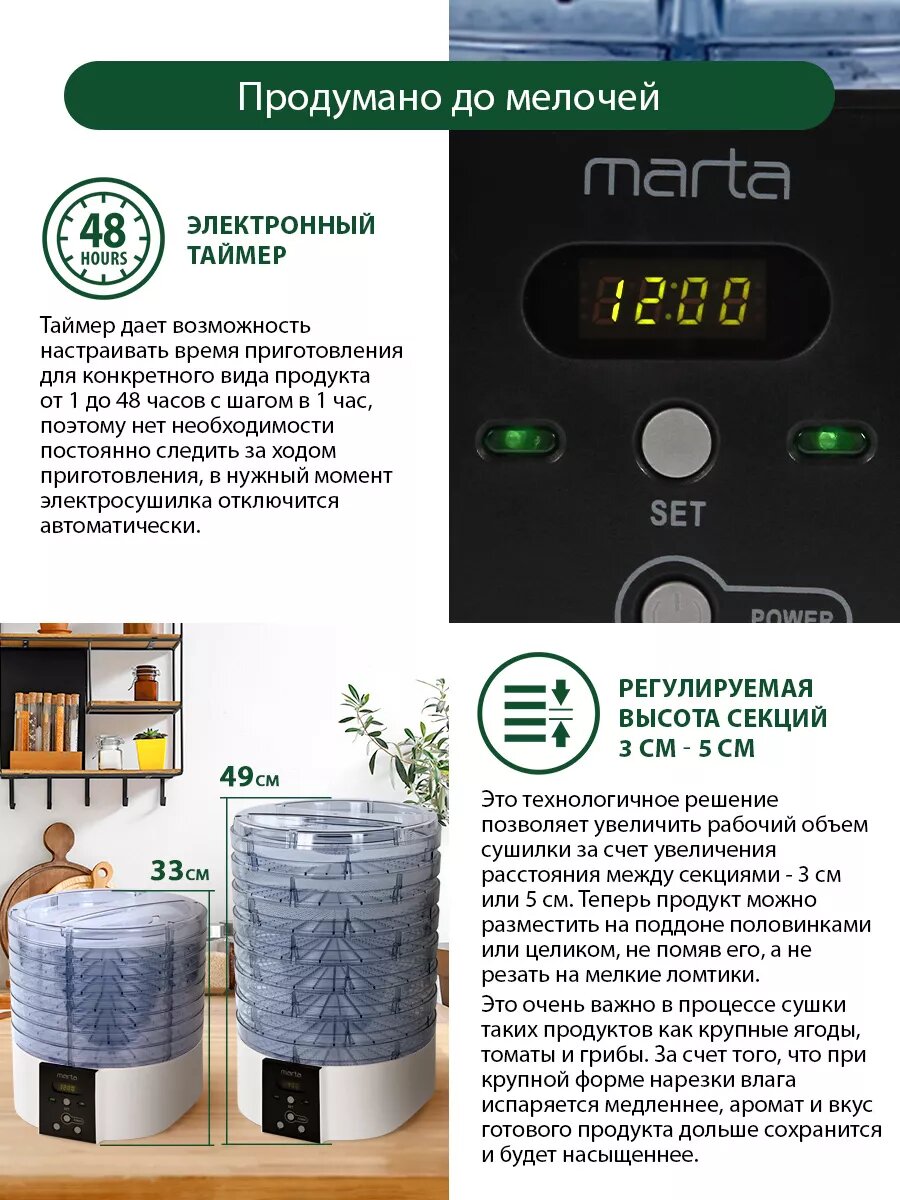 Сушилка для овощей и фруктов MARTA MT-1883 8 уровней + 1 поддон для пастилы + 3 для ягод с электронным контролем температуры, белый жемчуг интересное: