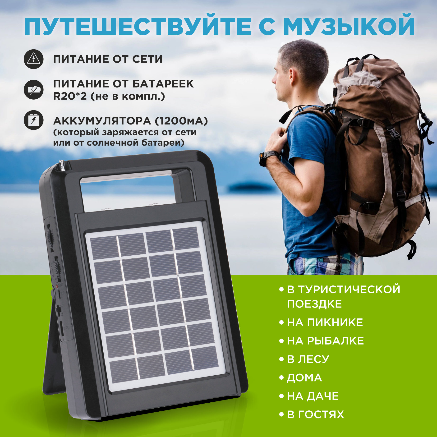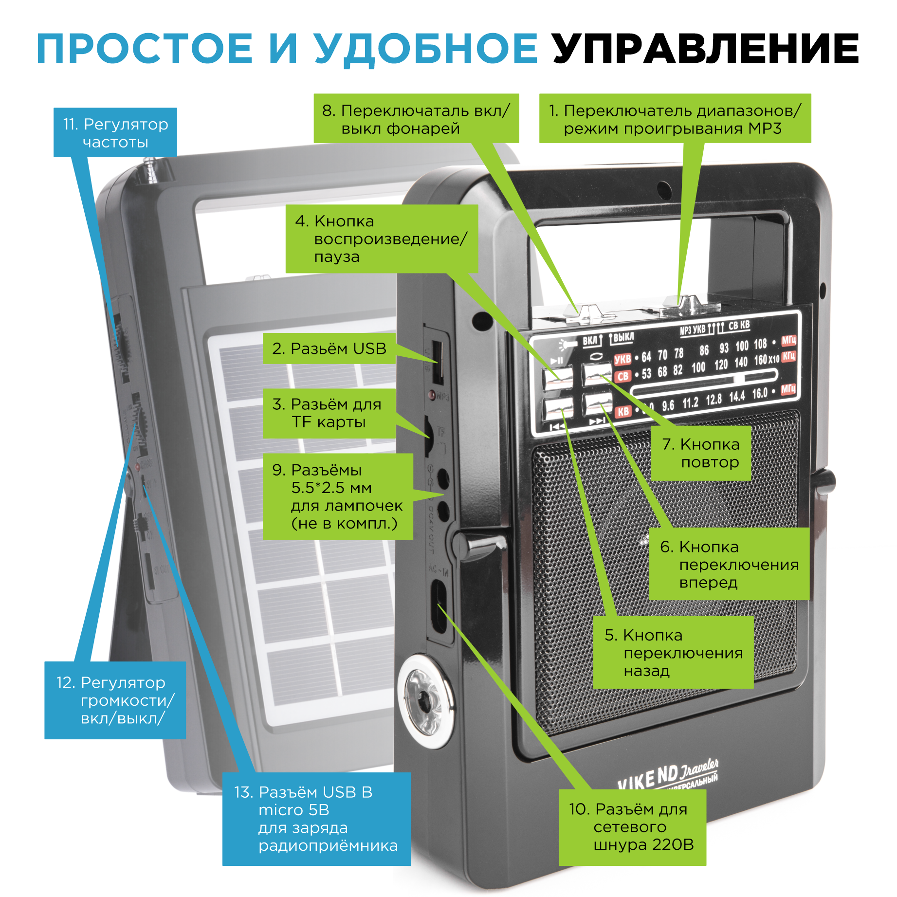 Радиоприемник VIKEND Traveler УКВ 64-108МГц В КВ акб1200мA бат.2*R20,USB/TF солн.бат 2*ламп