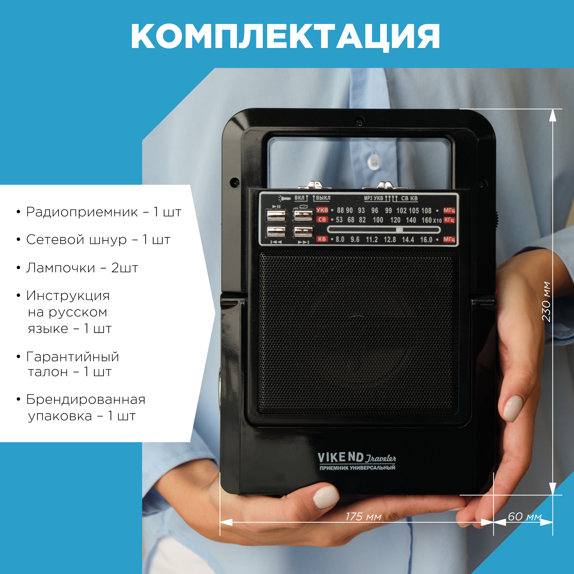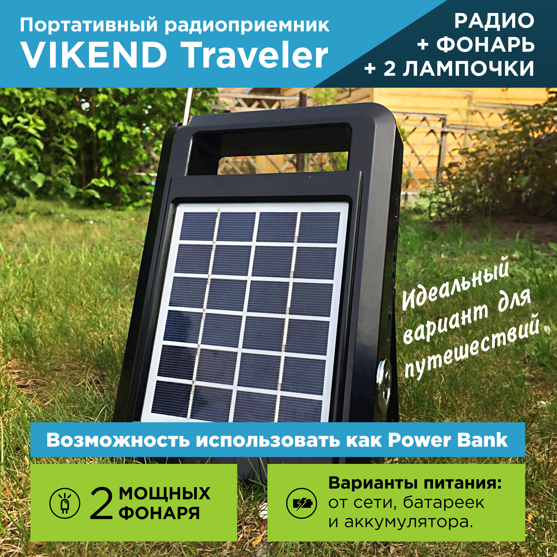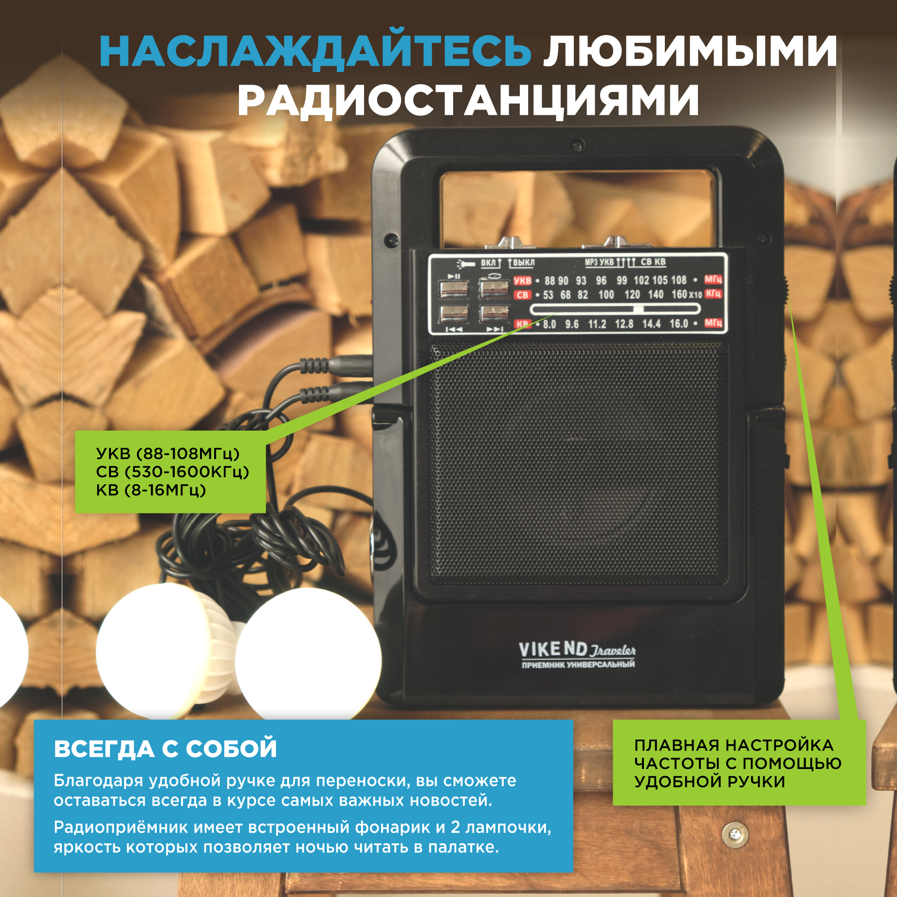 Радиоприемник "VIKEND Traveler", встроенный фонарик и 2 лампочки, черный