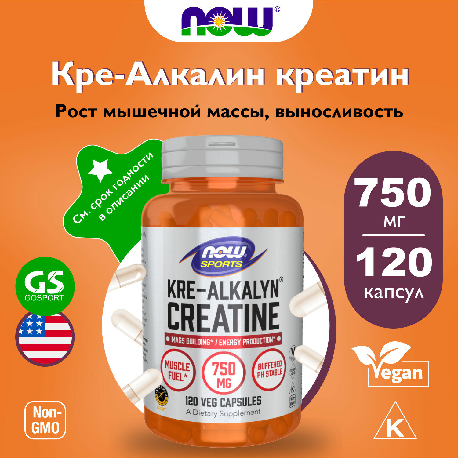 Креатин моногидрат NOW FOODS Kre-Alkalyn Creatine 750 mg 120 веган капсул
