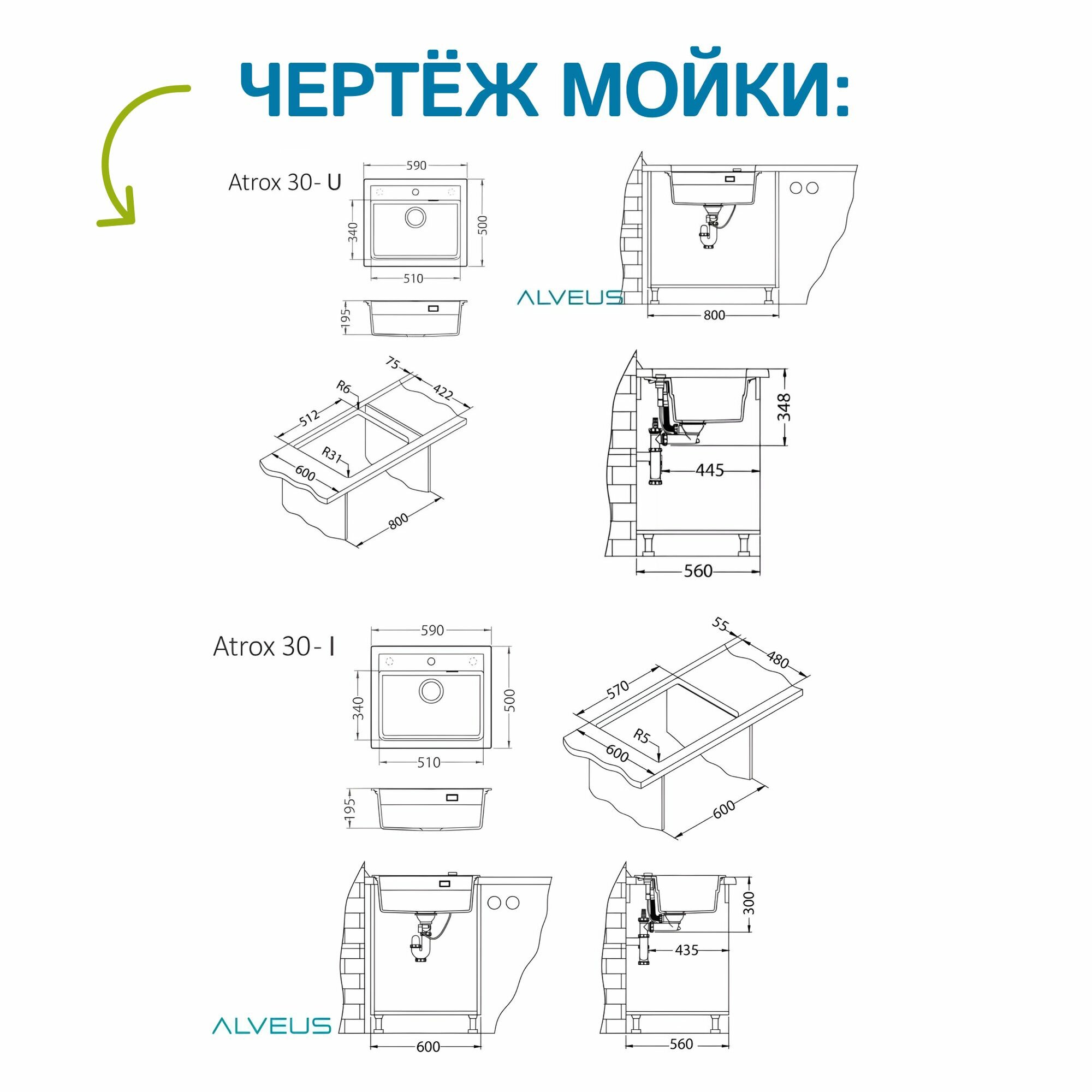 Мойка ALVEUS GRANITAL ATROX 30 CARBON - G91 590 X 500 1X в комплекте с сифоном 1132823,