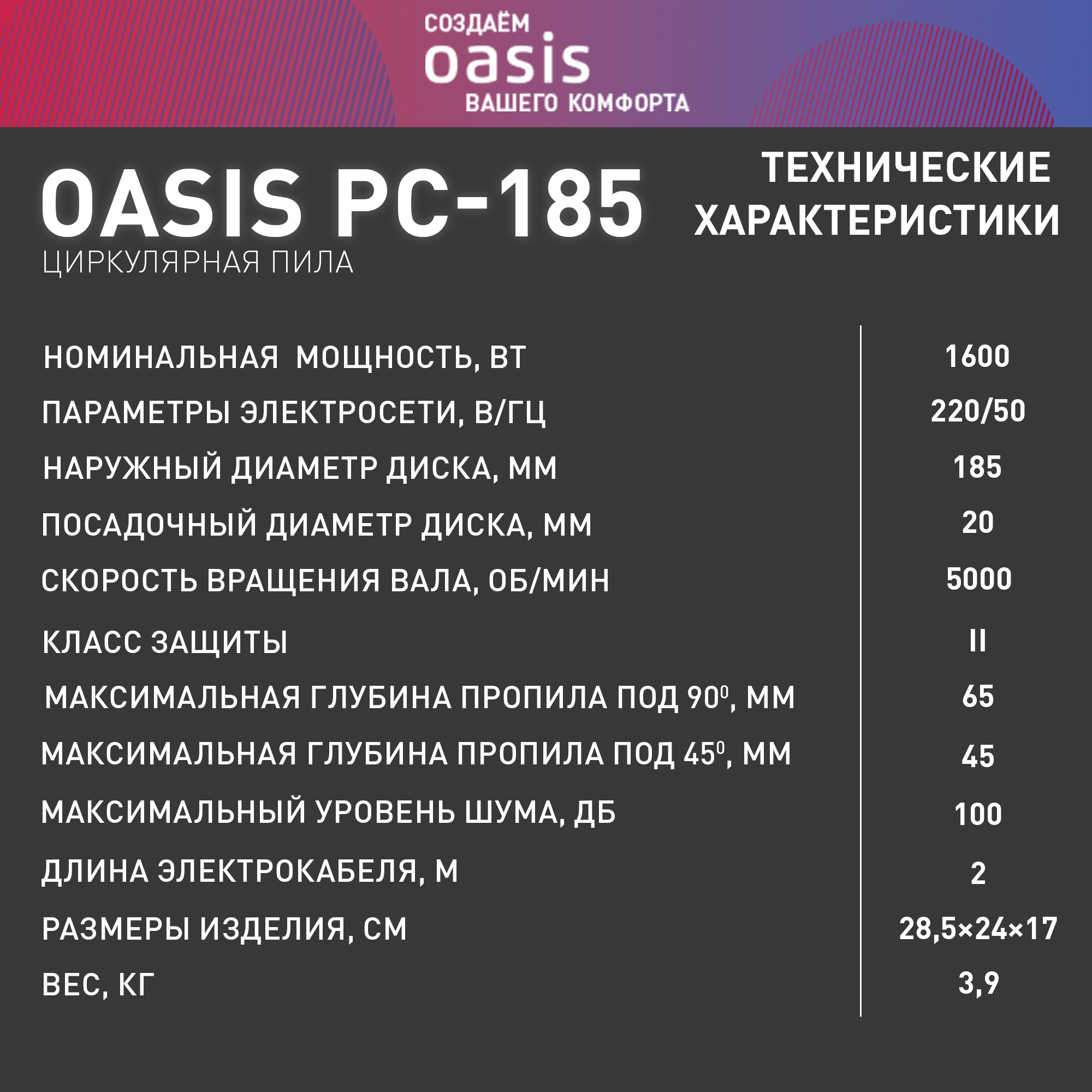 Пила циркулярная 1600ВТ 5000 об.МИН.диск 185ММ ВЕС 3,9КГ OASIS