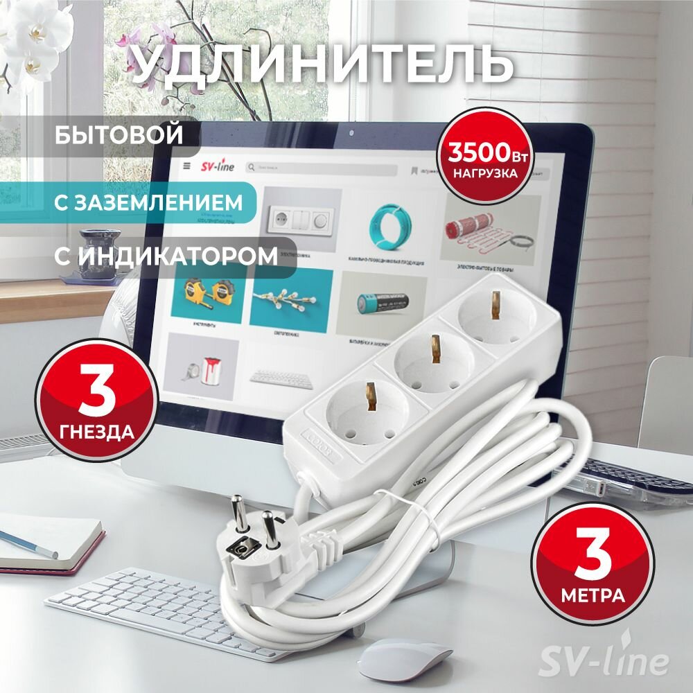 Удлинитель Союз 481S-8303, 3 розетки, 3 м, с/з, 16А / 3500 Вт белый