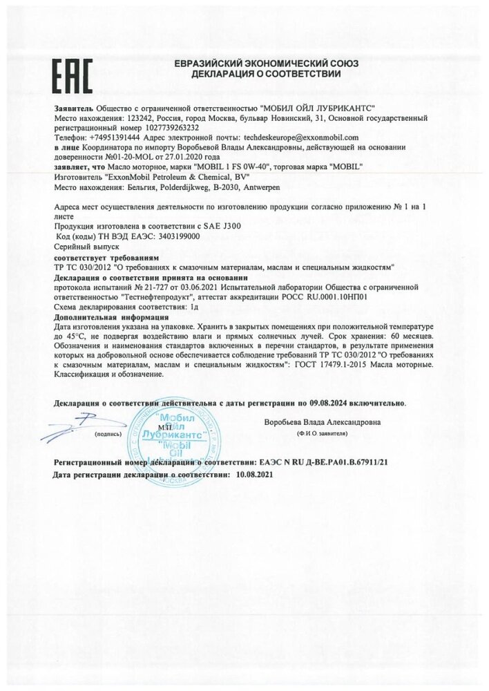 Моторное масло Mobil 1 FS 0W-40 1л MOBIL 153691