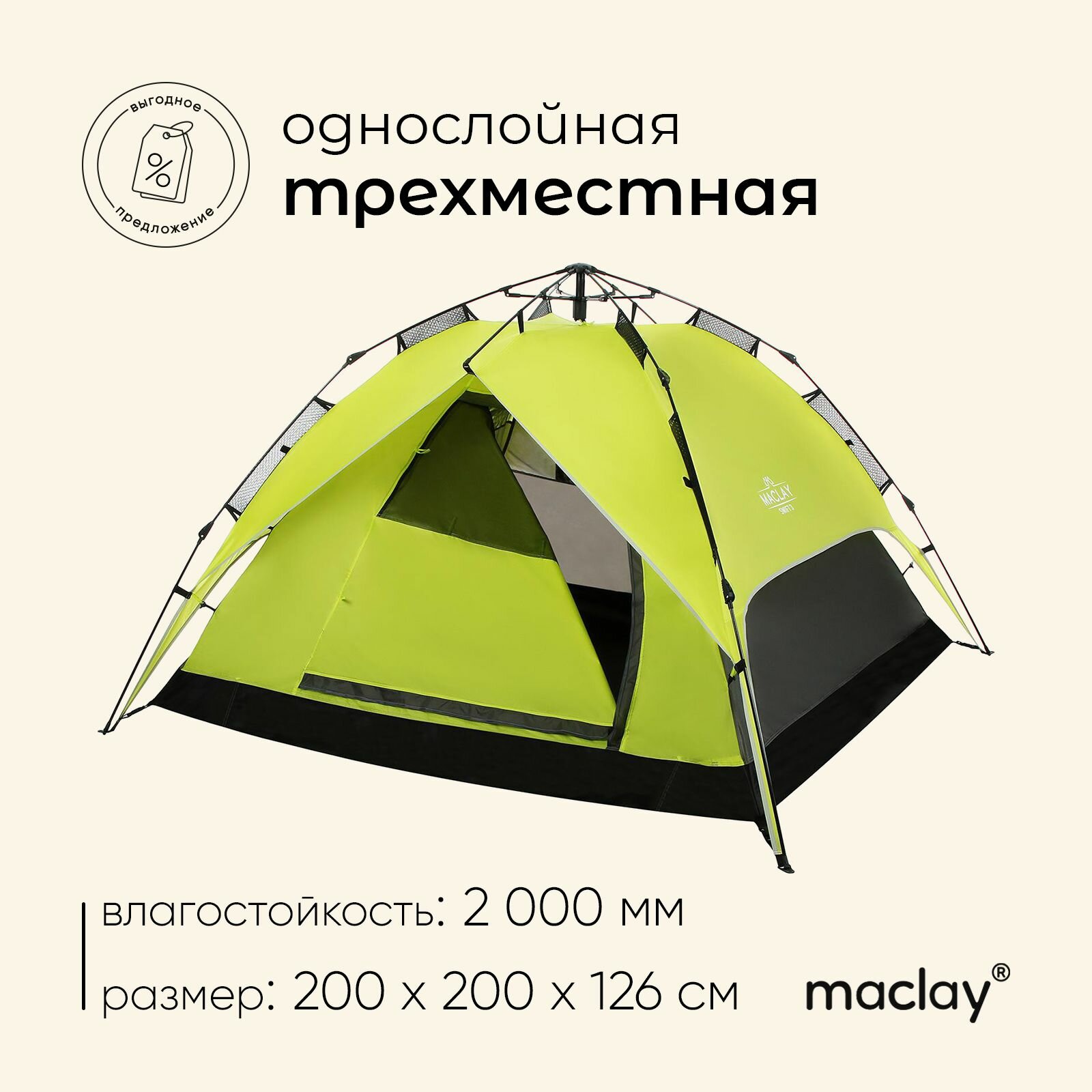 Maclay Палатка-автомат туристическая SWIFT 3, размер 200 х 200 х 126 см, 3-местная, однослойная