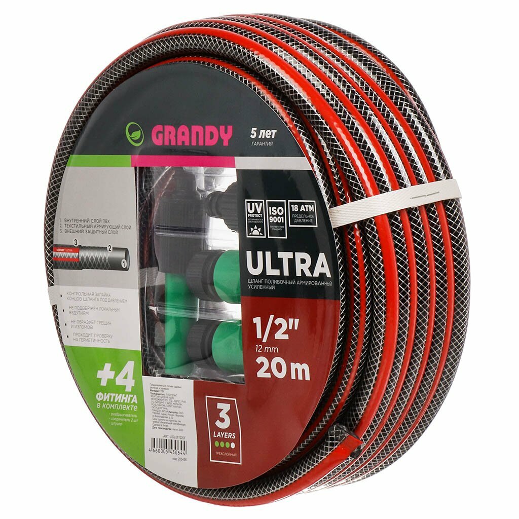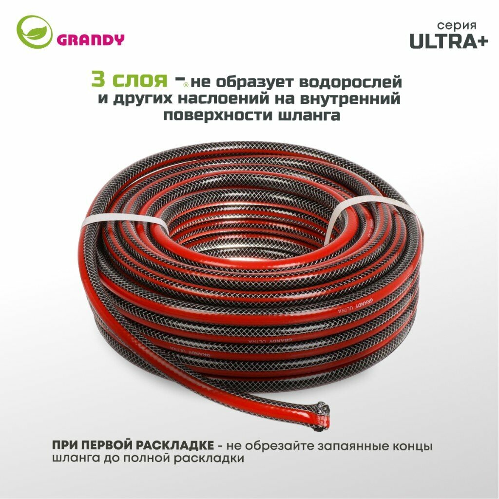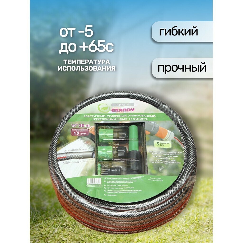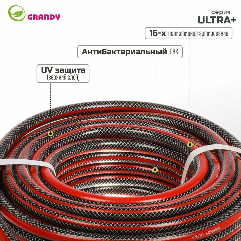 Шланг поливочный, 1/2 '', 12 мм, 18 атм, армированный, 20 м, 3 слоя, Grandy, Ultra+, ПВХ, с фитингами интересное: