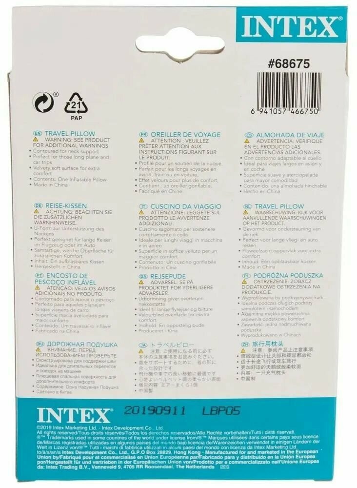 68675, Intex, Надувная подушка для шеи 36х30х10см