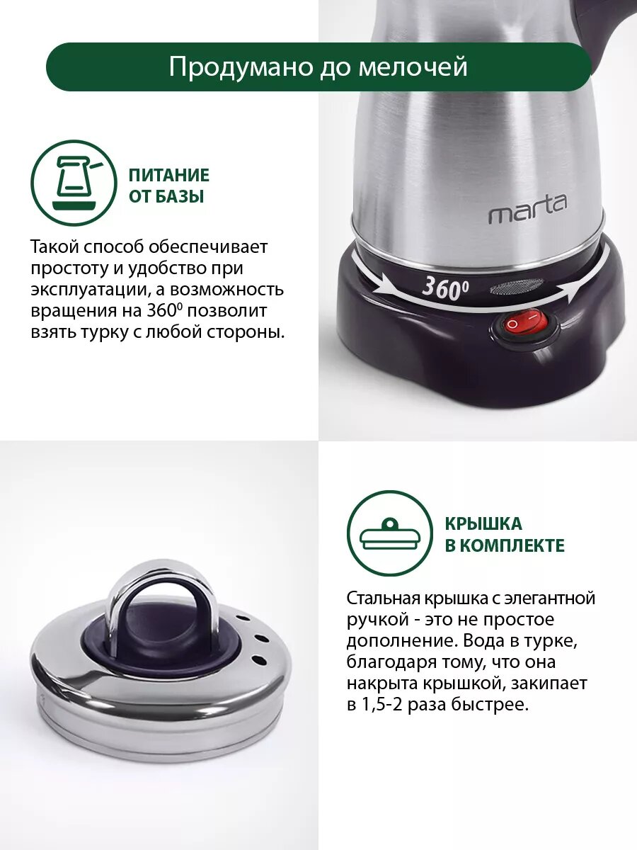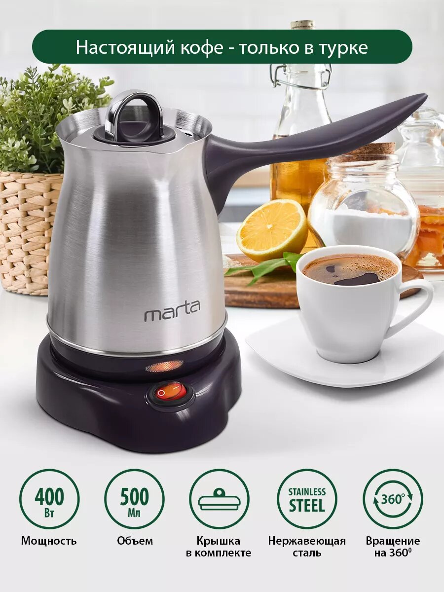 Турка для кофе электрическая Марта MT-2142 с теплоизоляционной ручкой колба из нержавеющей стали бордовый гранат/серебристый объем 500мл мощность