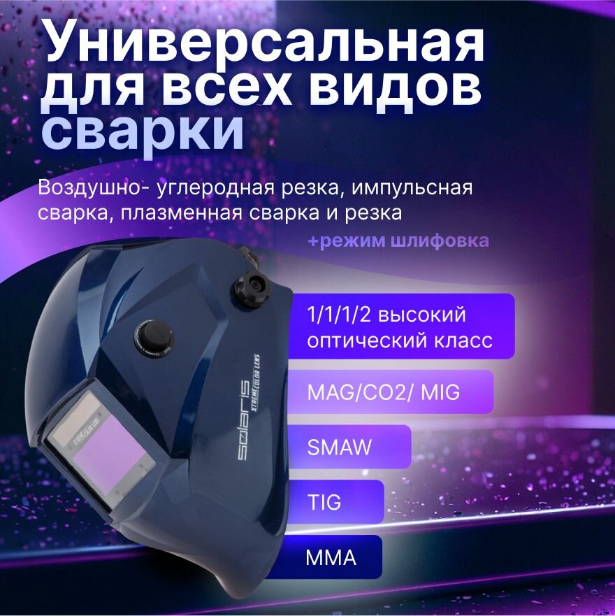 Щиток сварщика с самозатемняющимся светофильтром Solaris ASF650Х (синий металлик) (1/1/1/2, 100x45 мм (45,0 см2), DIN 3/9-13 (рег), 4 сенсора, естест