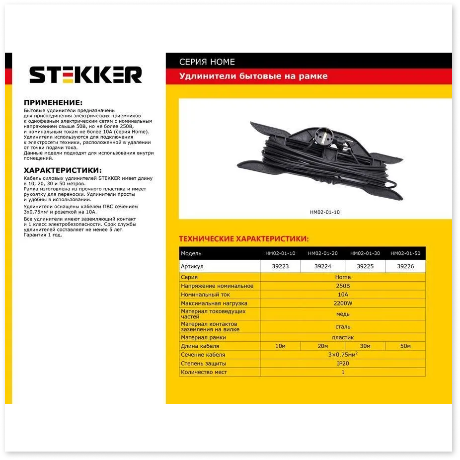 Удлинитель-шнур на рамке 1-местный c/з , HM02-01-20, 20м, 3*0,75, серия Home (УХз-10), черный, STEKKER 39224 (1 шт.)