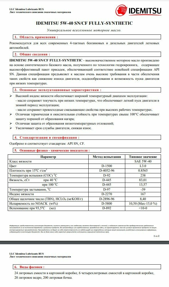 IDEMITSU Idemitsu 5W40 Sn/Cf 200Л | Fully-Synthetic