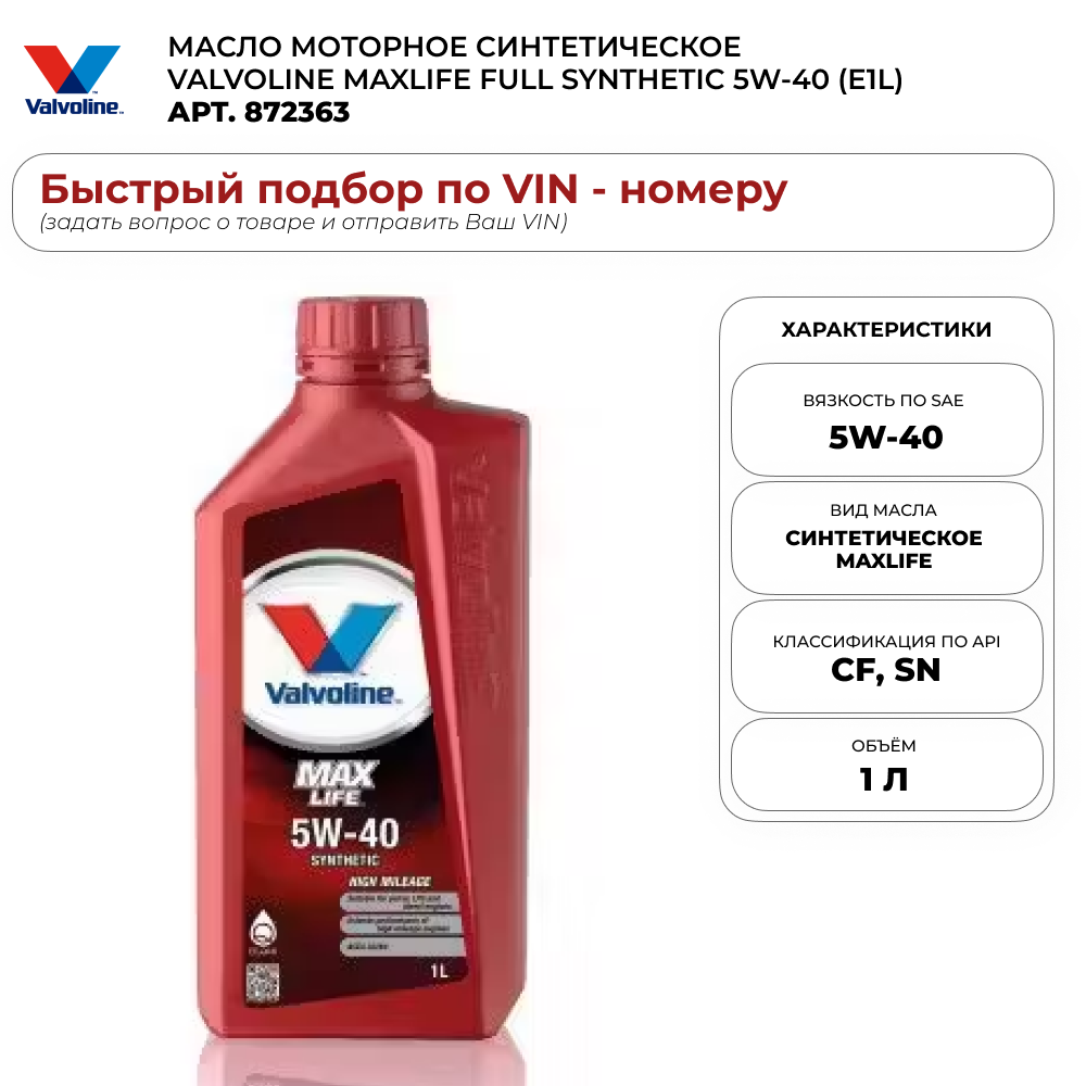 Valvoline 872363 масло моторное valvoline maxlife 5w-40 (1л)