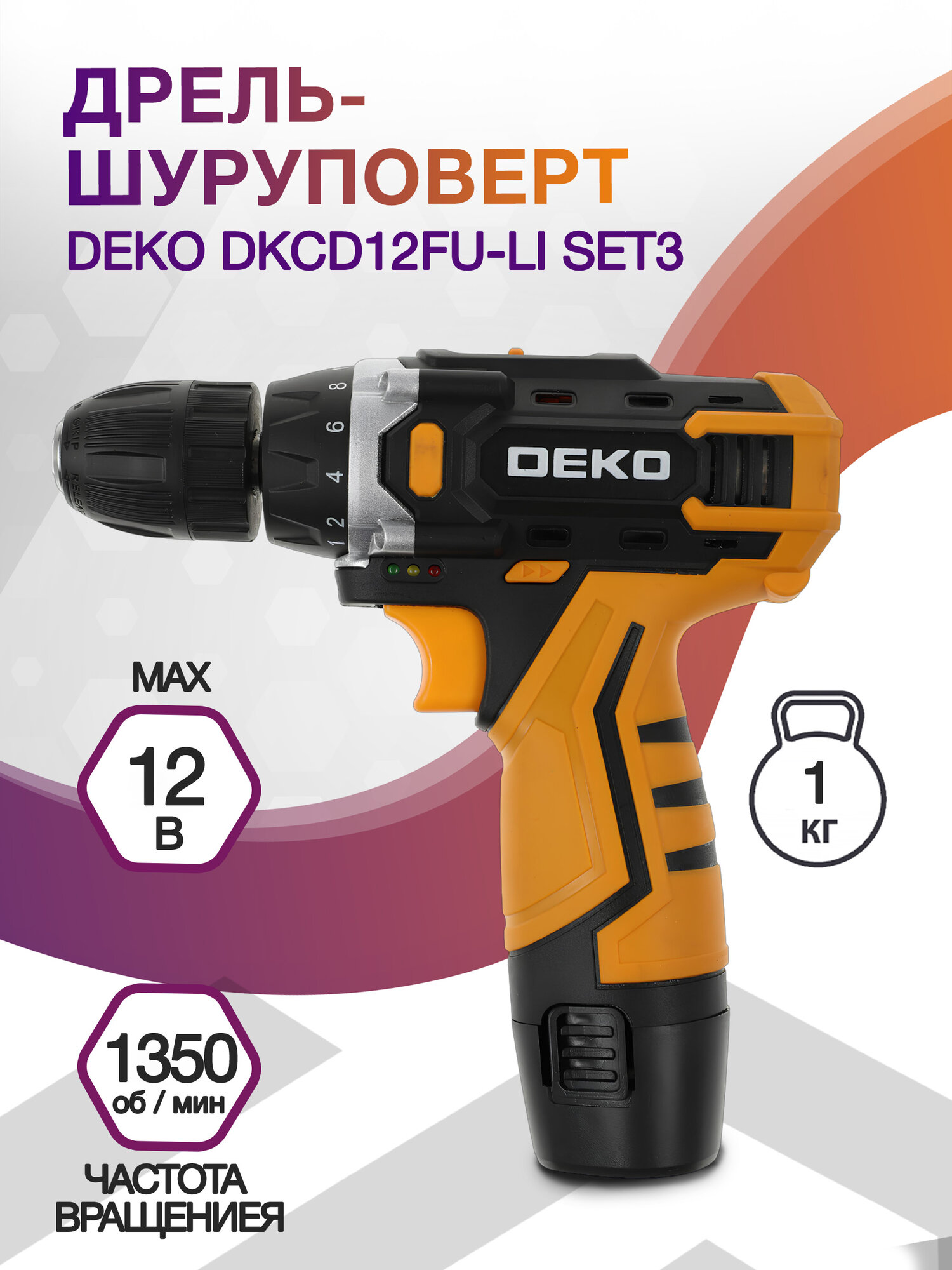 Дрель-шуруповерт DEKO DKCD12FU-Li SET3 1.5Ач, с двумя аккумуляторами [063-4173]