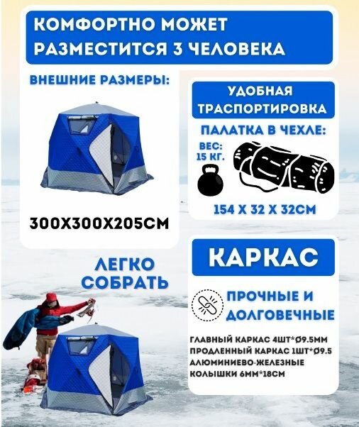 Просторная, широкая, высокая. Можно ловить в полный рост. Мы ставили 2 раскладушки, печку - рыбачили три дня! Красота! Ркеомендую |