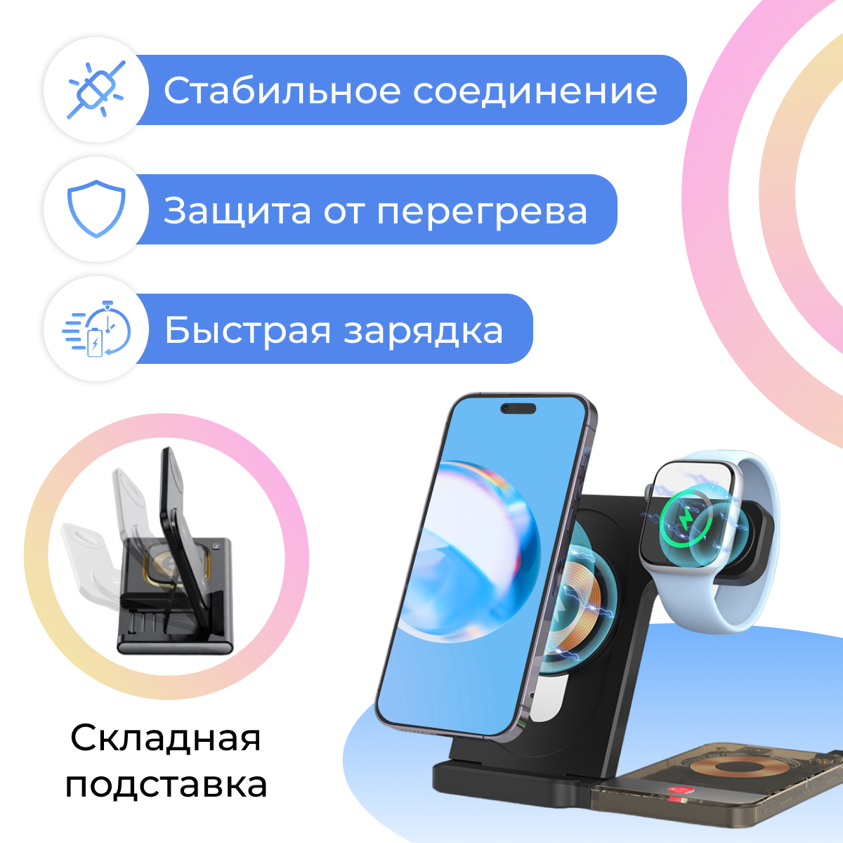 Беспроводная док станция 5 в 1 MagSafe 15W для Apple iPhone, Apple Watch и AirPods / Зарядка на Эпл Айфон, Эпл Вотч и Айрподс / Черная