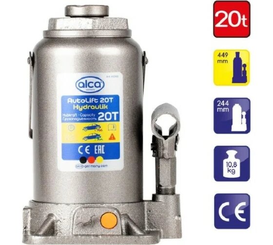 Ниже Вы можете прочитать отзывы на Alca Домкрат гидравлический 20 т. (h 244-449 мм.) 433300, ознакомится с подробными характеристиками, посмотреть интересные обзоры и фотографии на Alca Домкрат гидравлический 20 т. (h 244-449 мм.) 433300.