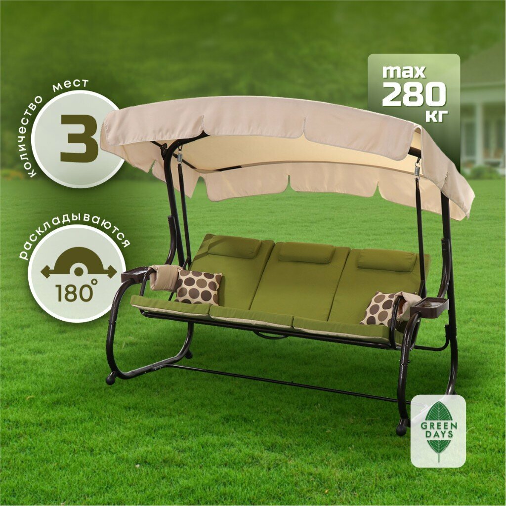 Качели садовые 3-местные, 220х130х177 см, 280 кг, Green Days, раскладываются в кровать, зеленые, YTSW3045-5S, металл интересное: