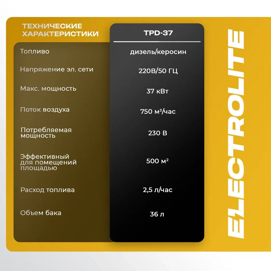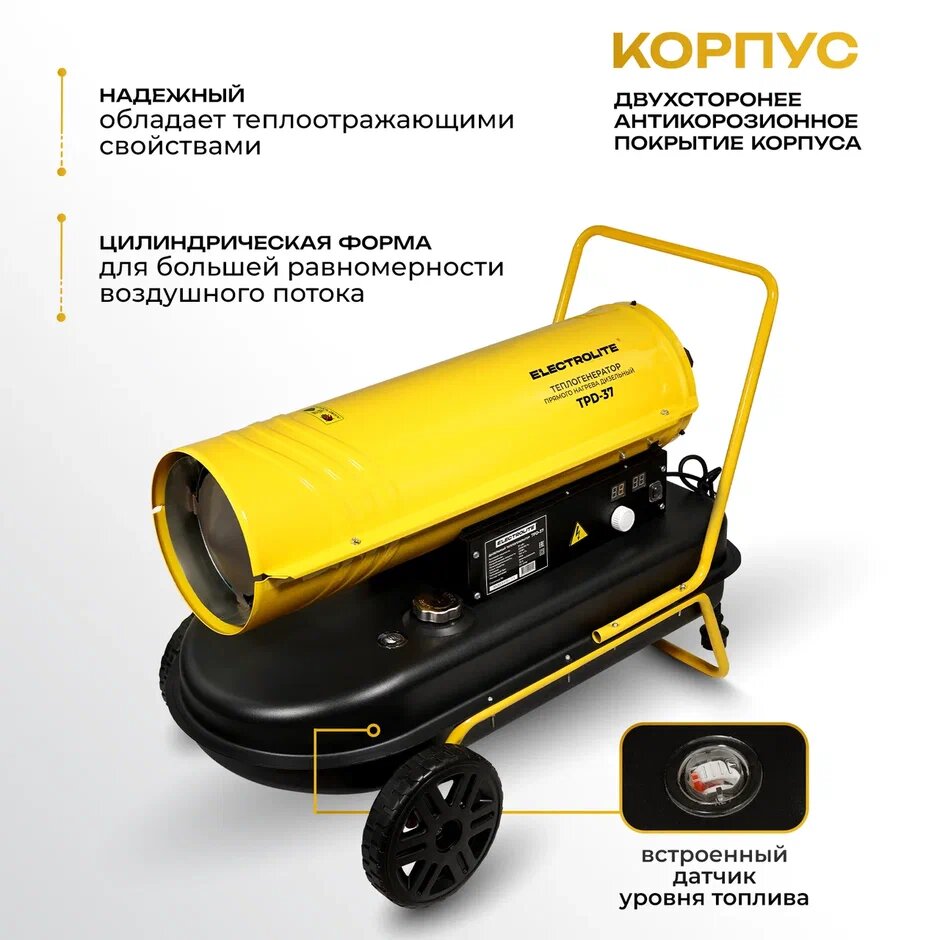 СохранитьТепловая пушка дизельная ELECTROLITE TPD-37 (37000 Вт, 750 м3/час, 220 В, 2.8 л/час, Термостат) интересное: