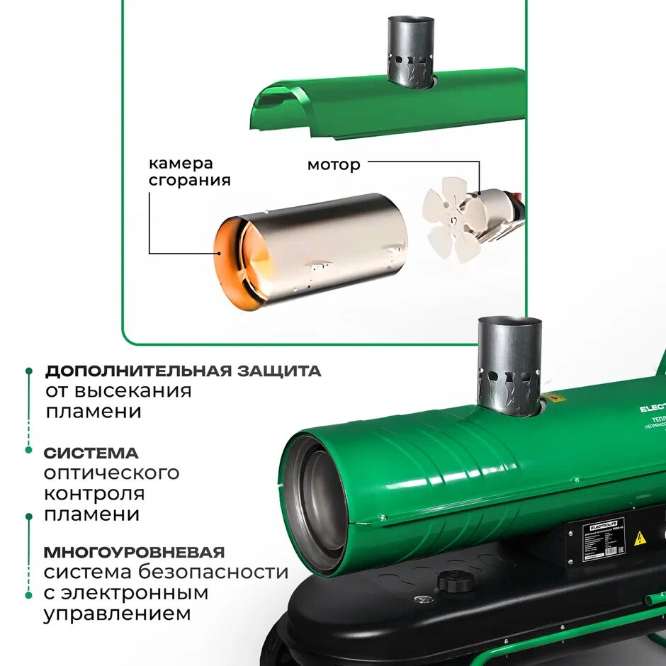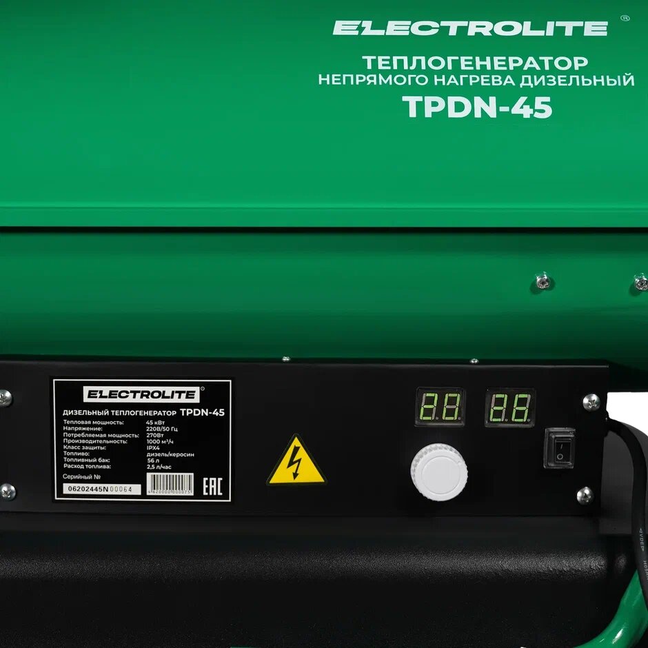 Тепловая пушка / Дизельная тепловая пушка / Пушка тепловая / Тепловая пушка дизельная Electrolite TPDN-25EL ( 25000 Вт, 900 м3/час, 1.7 л/час, 36 л бак, непрямой нагрев) с электронной регулировкой температуры