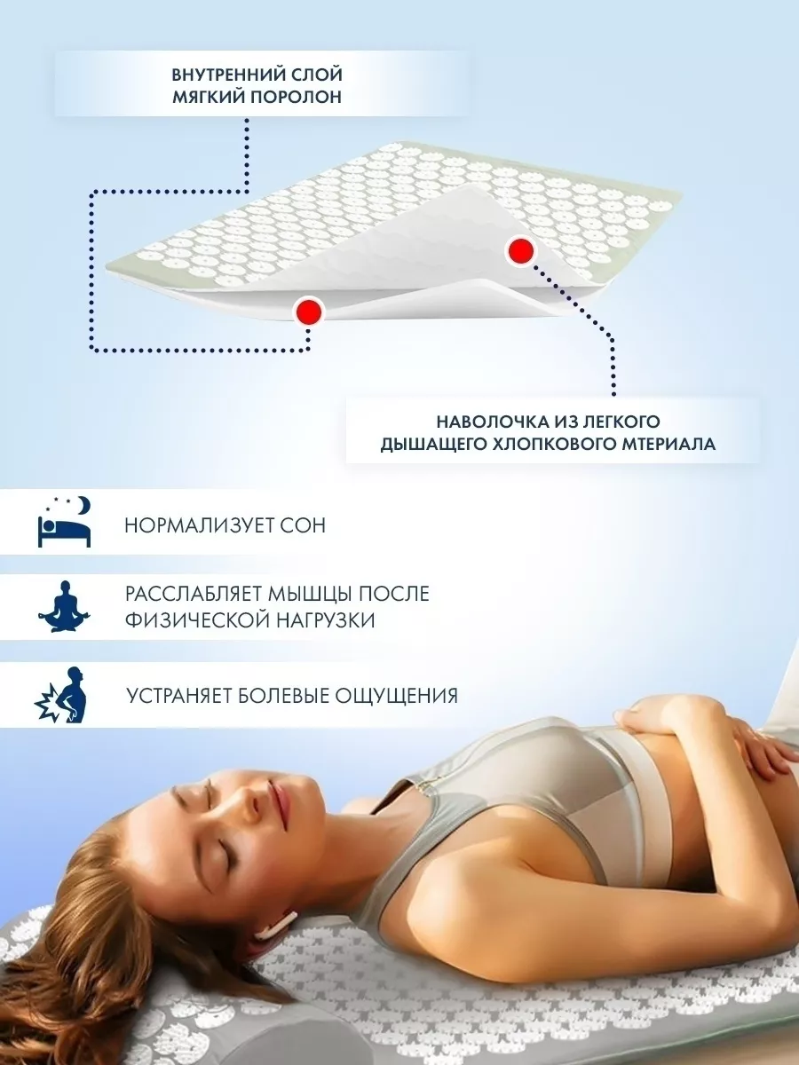 Отличный наборчик, который меня буквально спасает при болях в спине и шее. Я использую как коврик, так и валик.Когда в первый раз использовала, думала больно будет, но нет. Он скорее наоборот снимает напряжение в спине и шейном отделе позвоночника и дарит чувство расслабления. После него чувствуешь себя просто заново рожденной и боли долго не возвращаются.