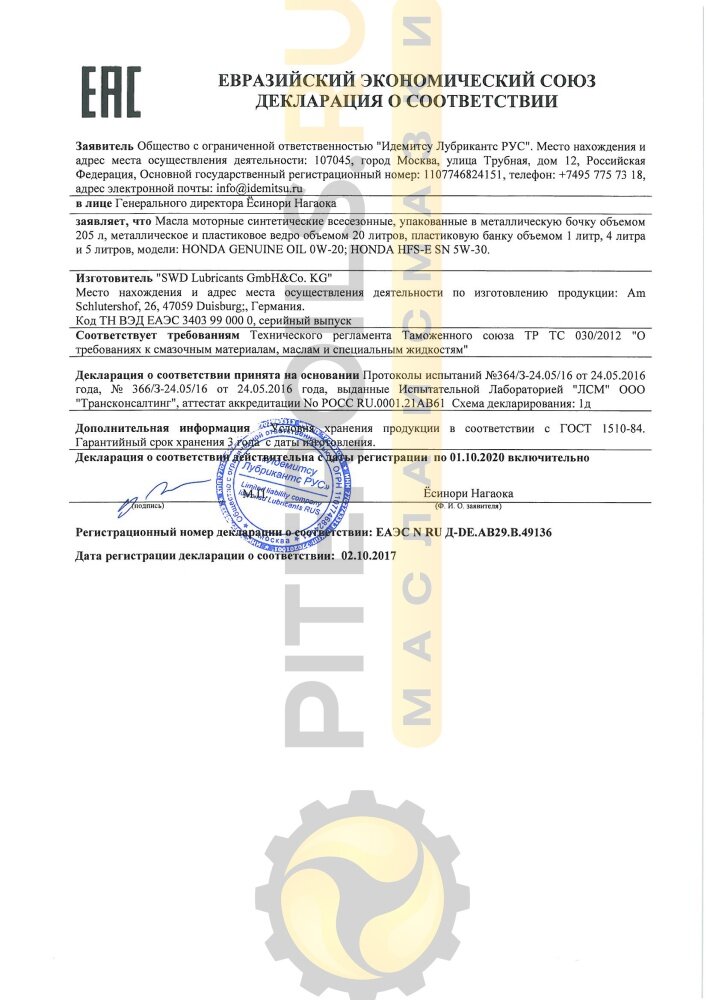 Моторное масло 0W20 HONDA синтетическое (4л.)
