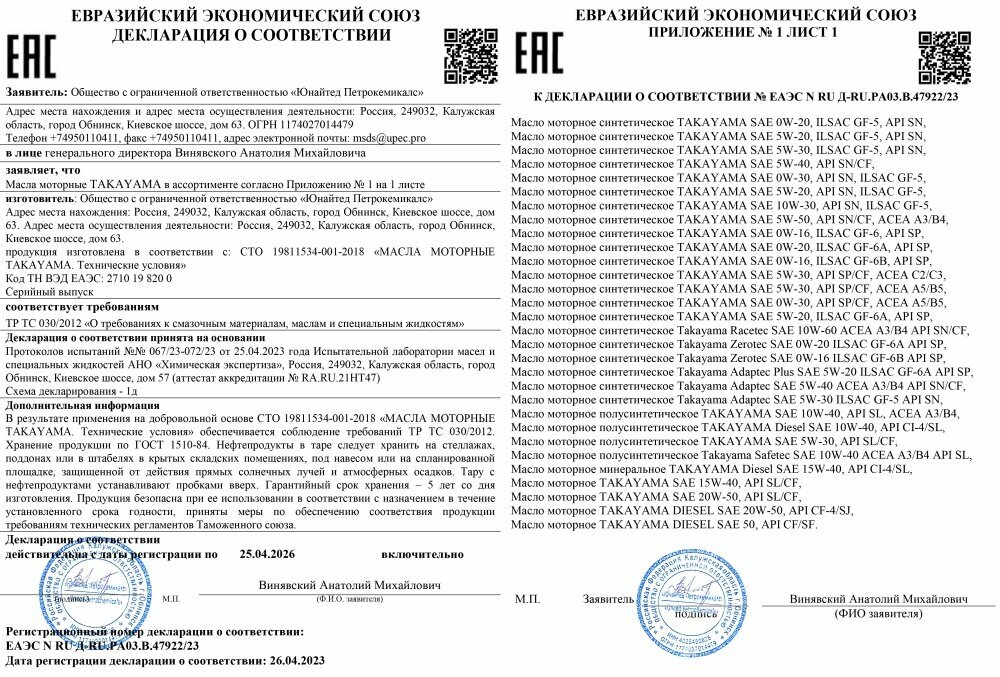 | Отзыв: | Занимаюсь продажей автомобильных масел много лет. Считаю, Takayama - одно из лучших масел в данной ценовой категории! Намного дешевле иностранных аналогов.
