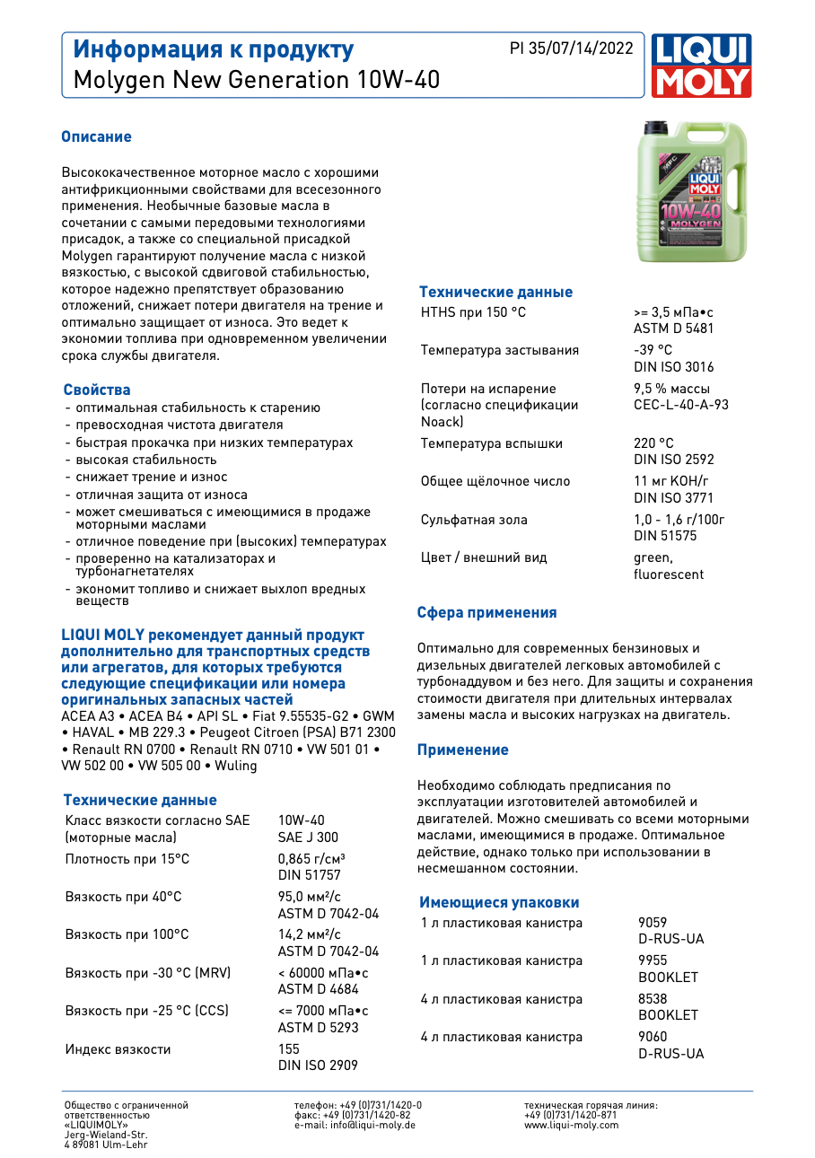 Liqui moly Molygen New Generation 10w40 Hc-Синтетическое Моторное Масло 4л. Liqui Moly 9060 В Подольске